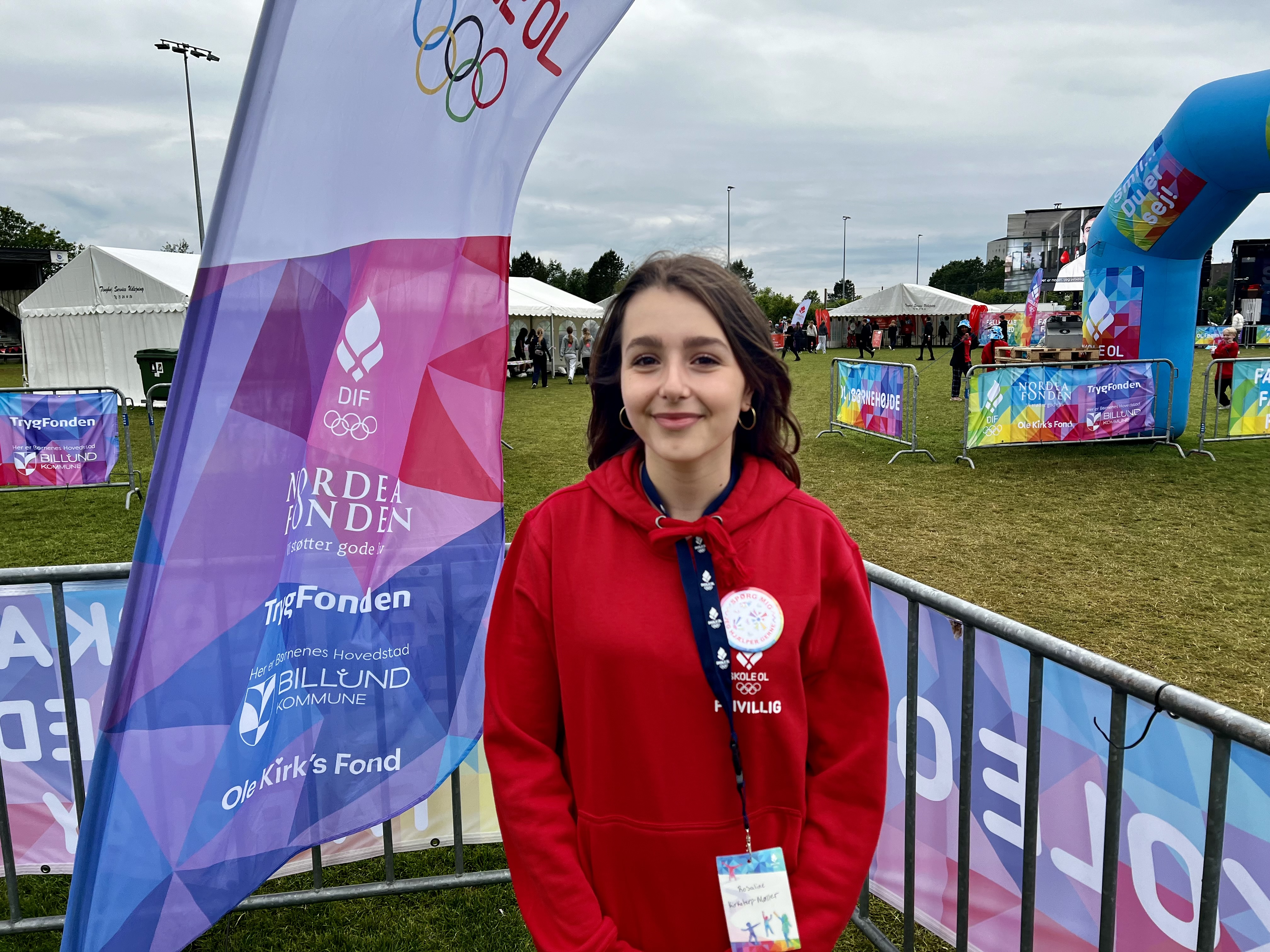 Både om dagen til Skole OL-finalen og om aftenen til de to folkefester har de omkring 600 frivillige i denne uge ydet en værdsat indsats. En af de frivillige er Rosaline Kirketerp-Møller, som til dagligt går i 7. klasse på The International School of Billund. Rosaline var sidste år frivillig til Skole OL-finalen, og i år er hun igen trukket i frivilligtøjet, hvor hun sammen med sin klasse har hjulpet med være atletikdommere.