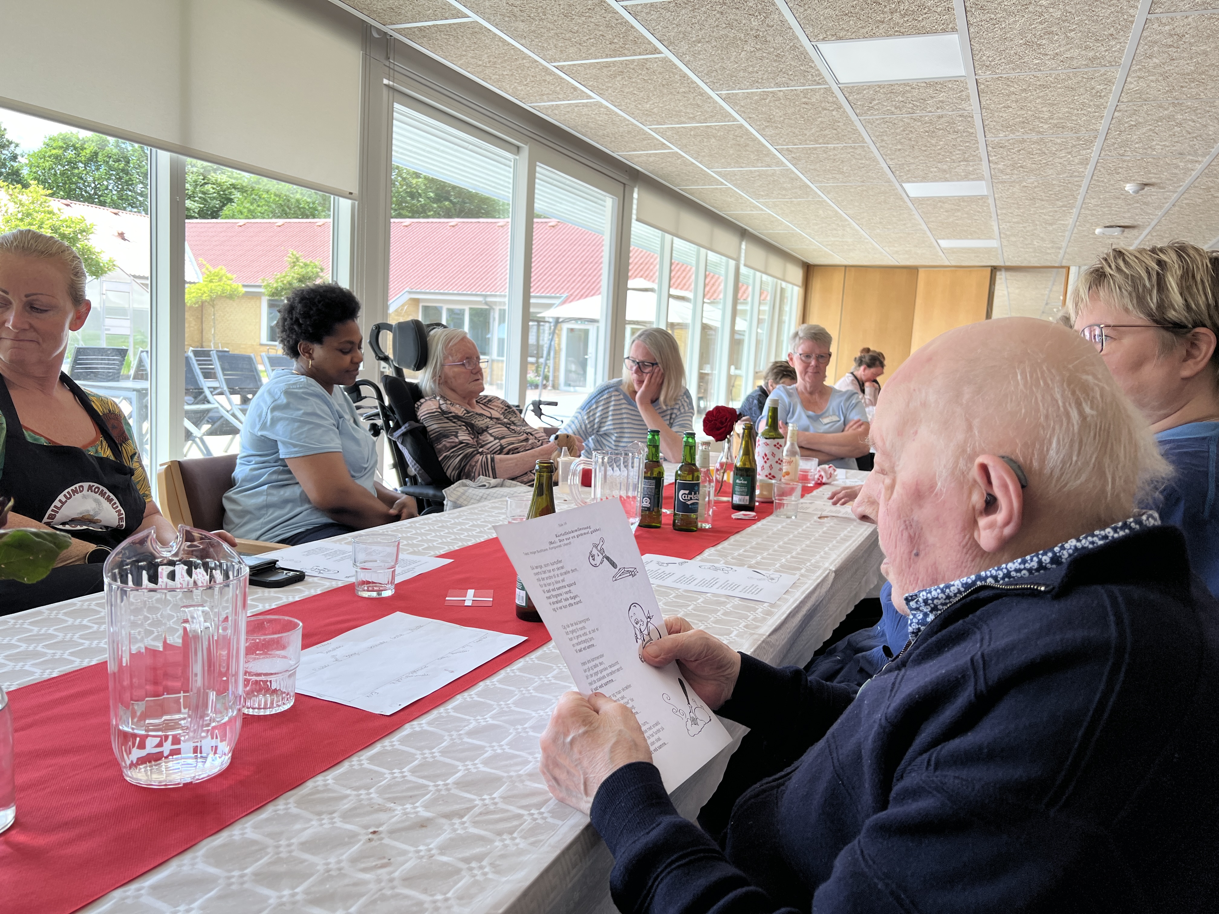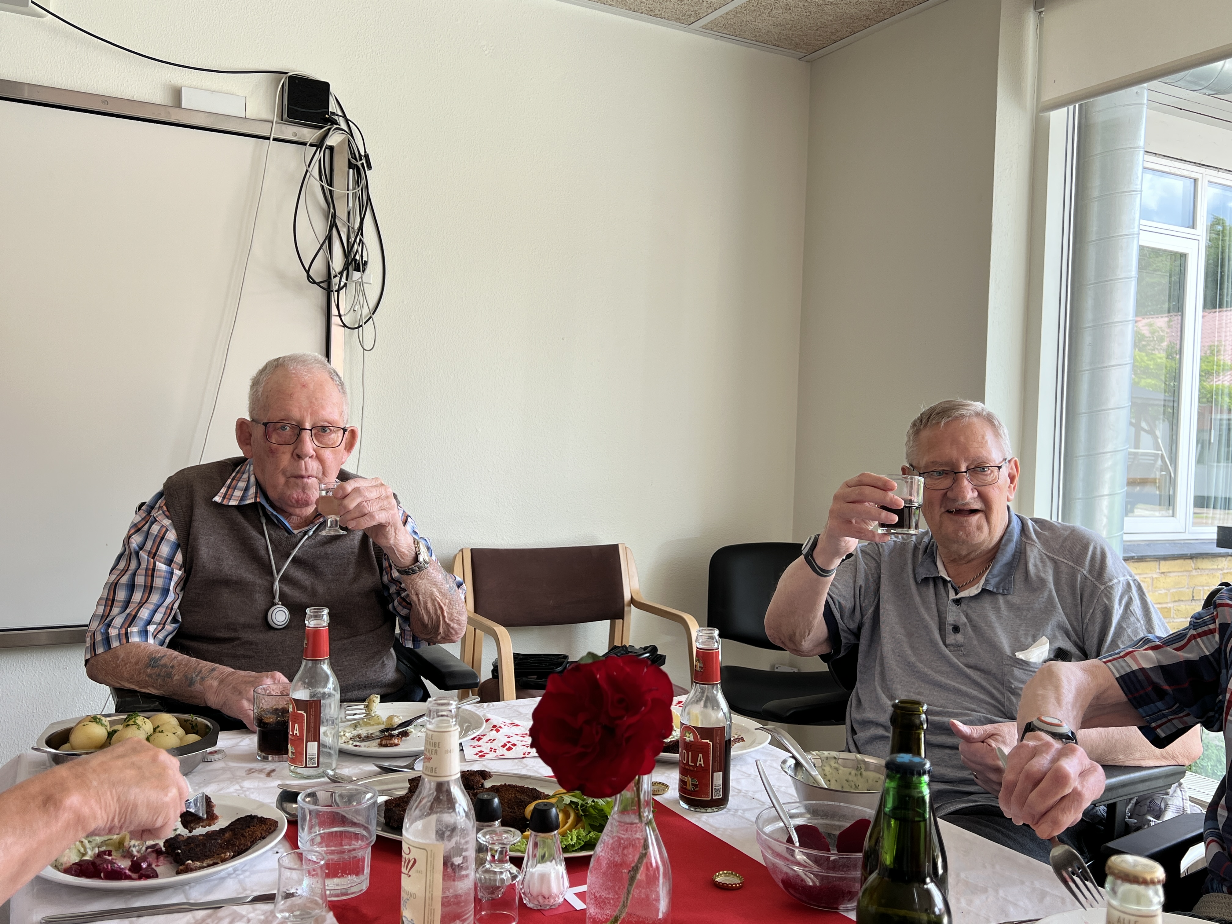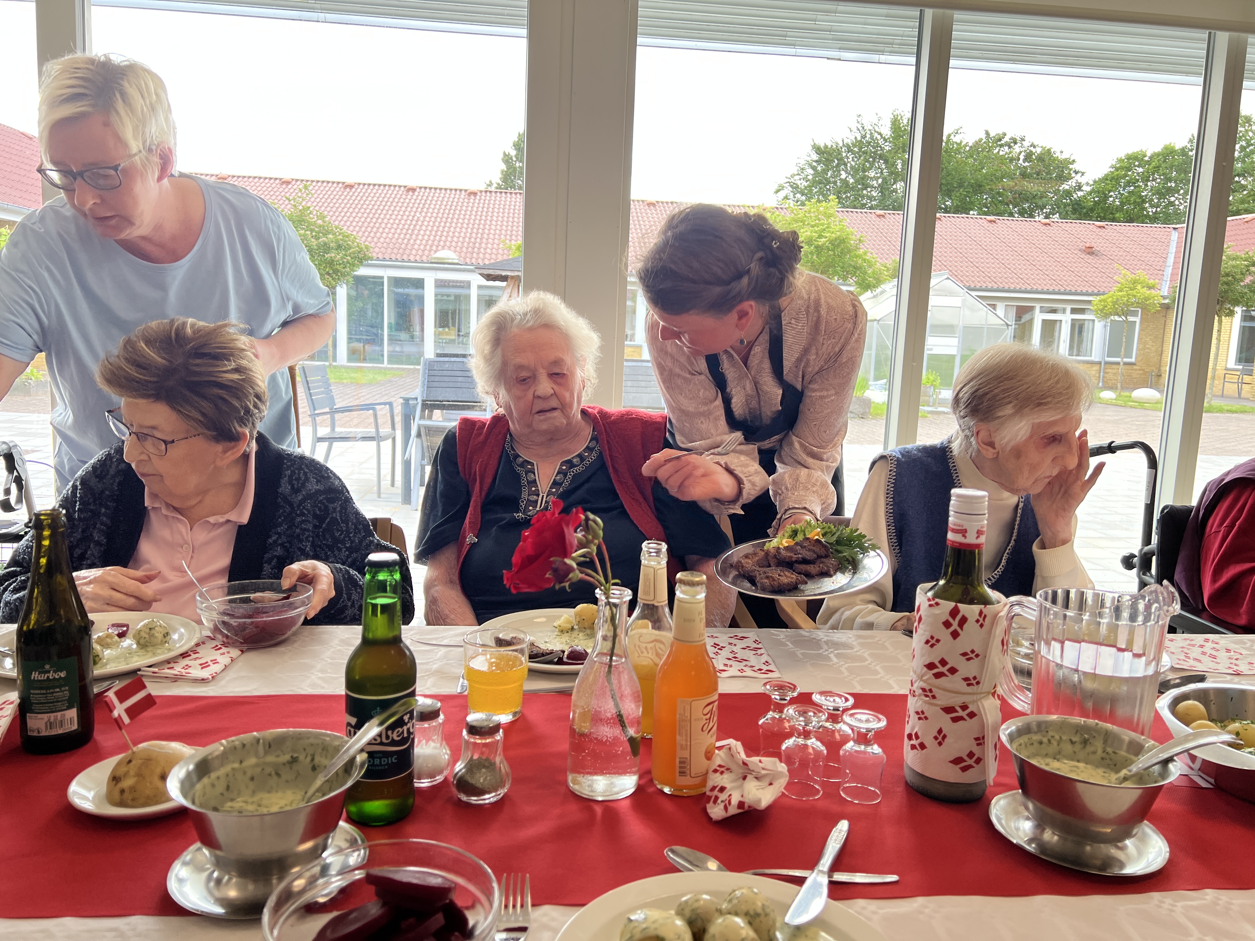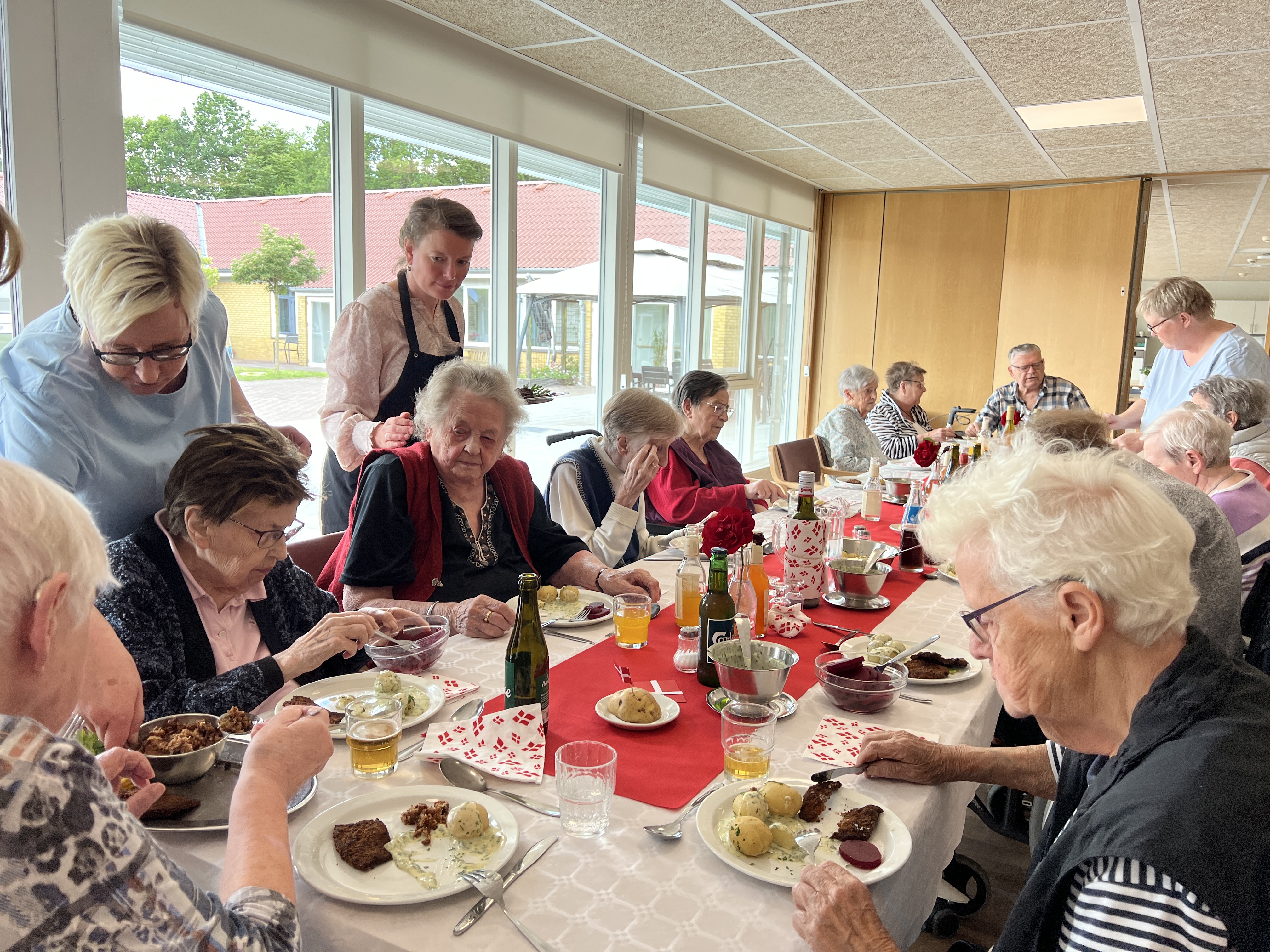 Der var feststemning og en duft af stegt flæsk på Fynsgade Plejehjem i Grindsted i dag, da beboerne til frokost fik serveret nye kartofler med stegt flæsk og persillesovs og en snaps for at fejre Valdemarsdag. Der var også plads til fællessang, og til dessert var der friske jordbær med flødeis.