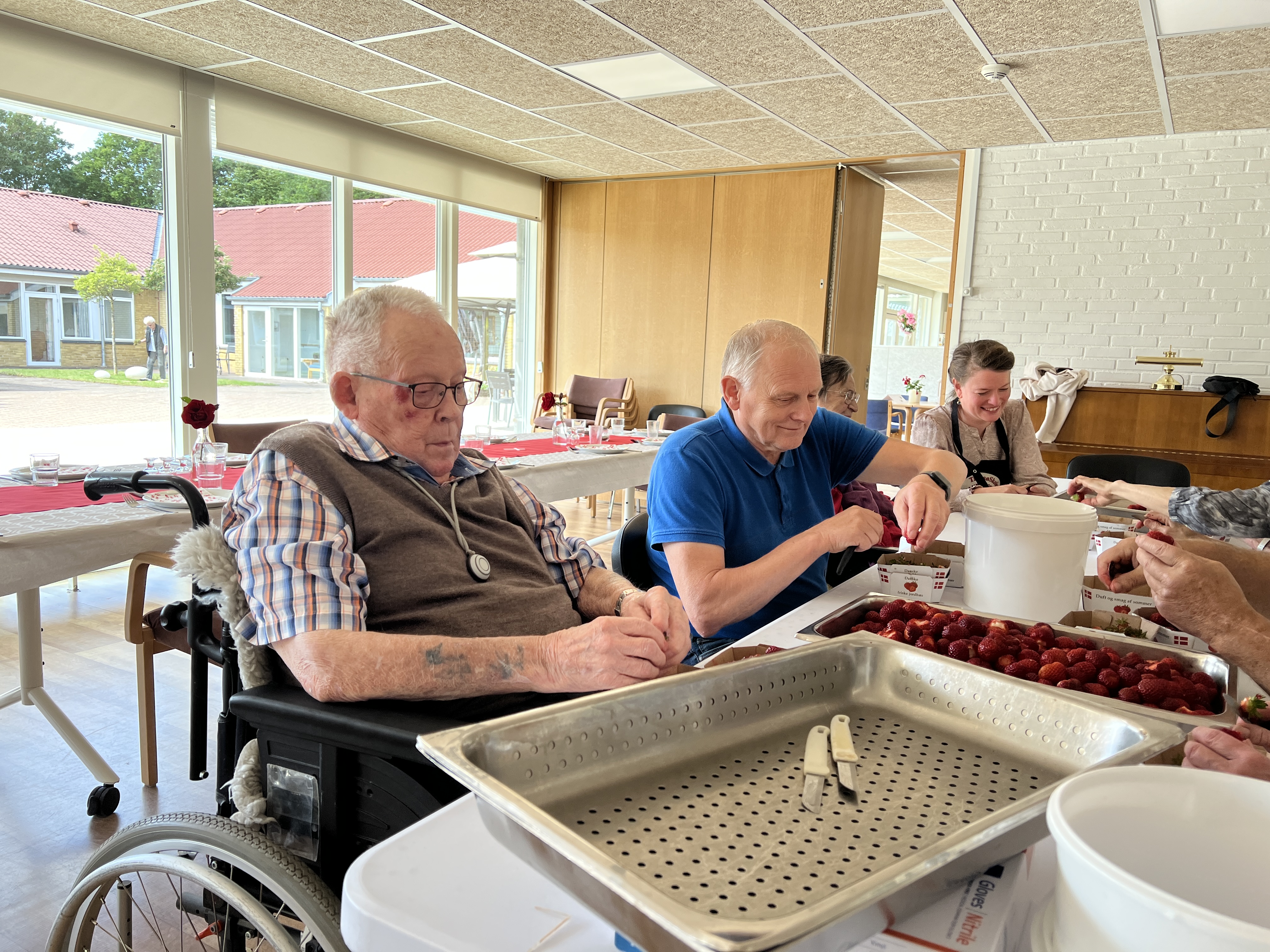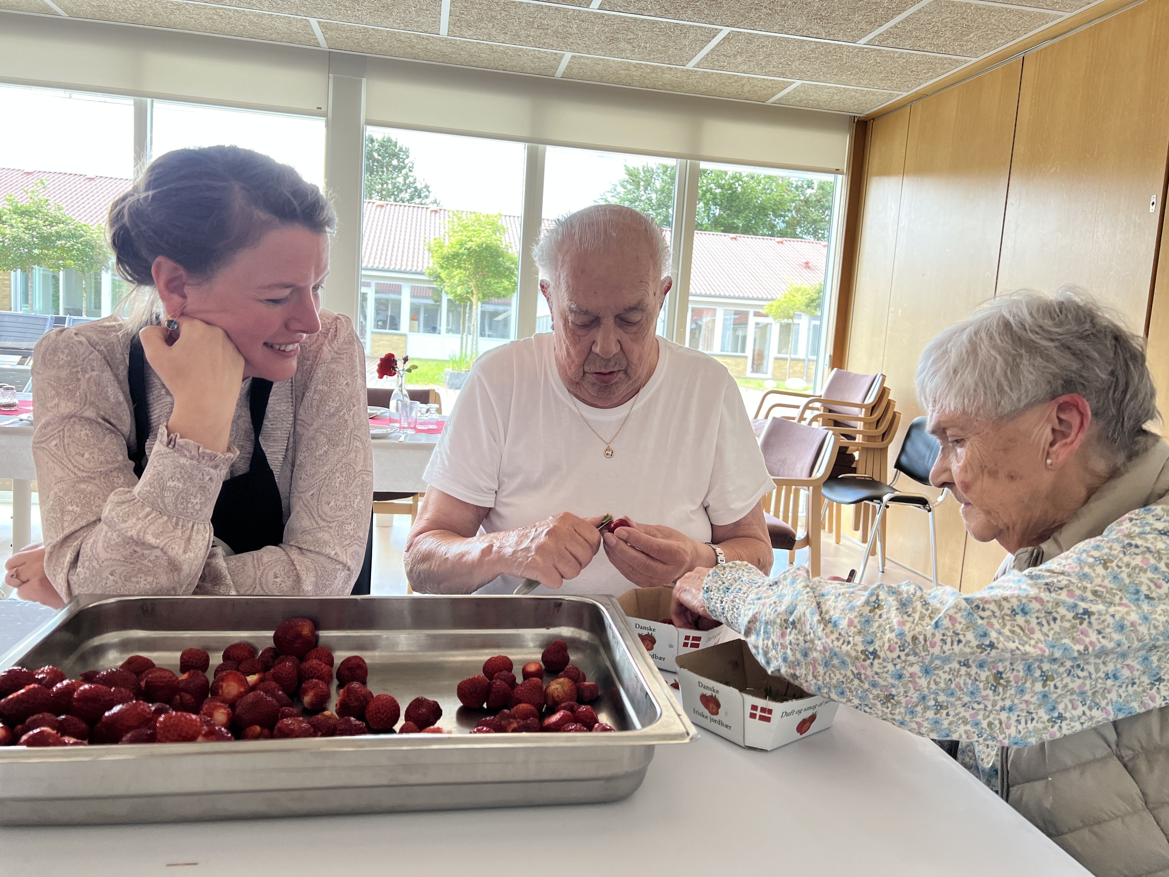Det er efterhånden en 25 år lang tradition, at Billund Kommunes Kartoffellaug sørger for nye danske kartofler og snaps til beboerne på kommunens plejehjem på Valdemarsdag. I dag, mandagen efter Valdemarsdag, er ingen undtagelse. Borgmester Stephanie Storbank var derfor inviteret med til kartoffelfest på Fynsgade Plejehjem, hvor hun hjalp med at pille jordbær til desserten.