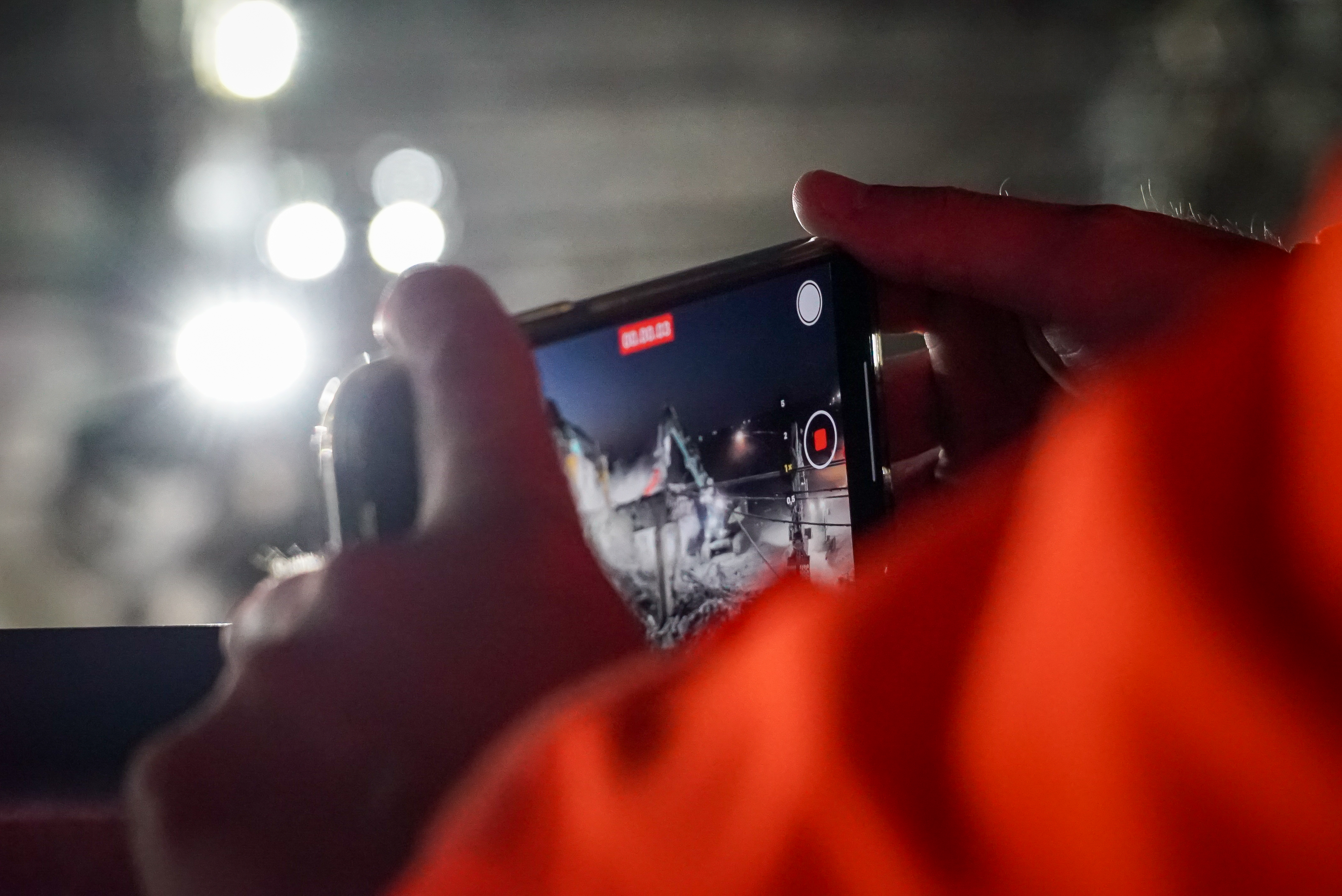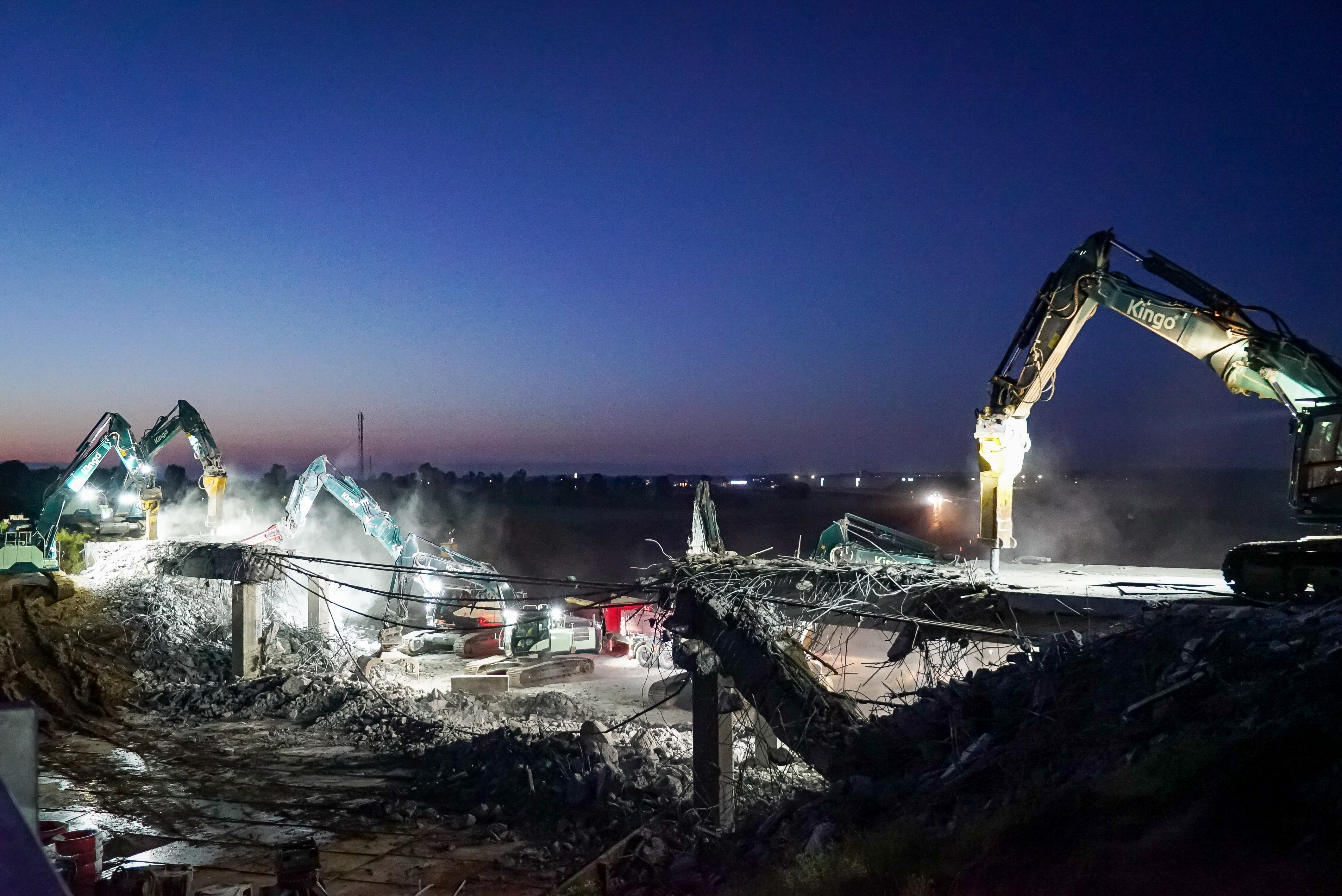 Selve nedbrydningen håndterede Kingo som underentreprenør, og afspærringen var Saferoad hyret ind til at stå for. I løbet af aftenen og natten blev størstedelen af det nedbrudte materiale kørt væk med lastbiler, imens Arkils mandskab og maskiner håndterede det, der var for stort til at komme direkte på en lastbil.