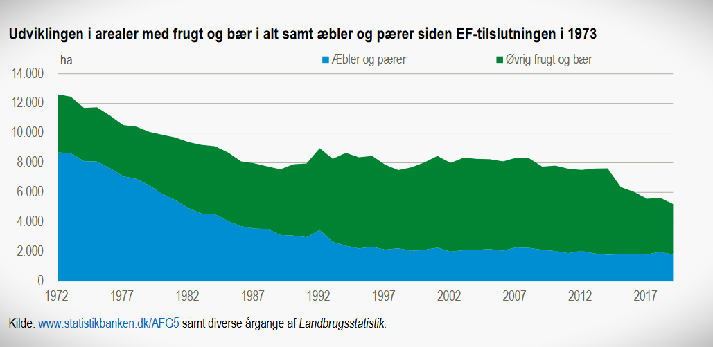 Danmarks Statistik har vist, at arealet med frugt og bær er mere end halveret siden EF-tilslutningen i 1973, og den udvikling kan hverken skyldes forbrugerne eller klimabekymringen. Afviklingen af bærproduktionen er i høj grad sket for at skaffe landbruget arealer til dyrkning af svinefoder i takt med udviklingen af den ekstremt store animalske produktion.