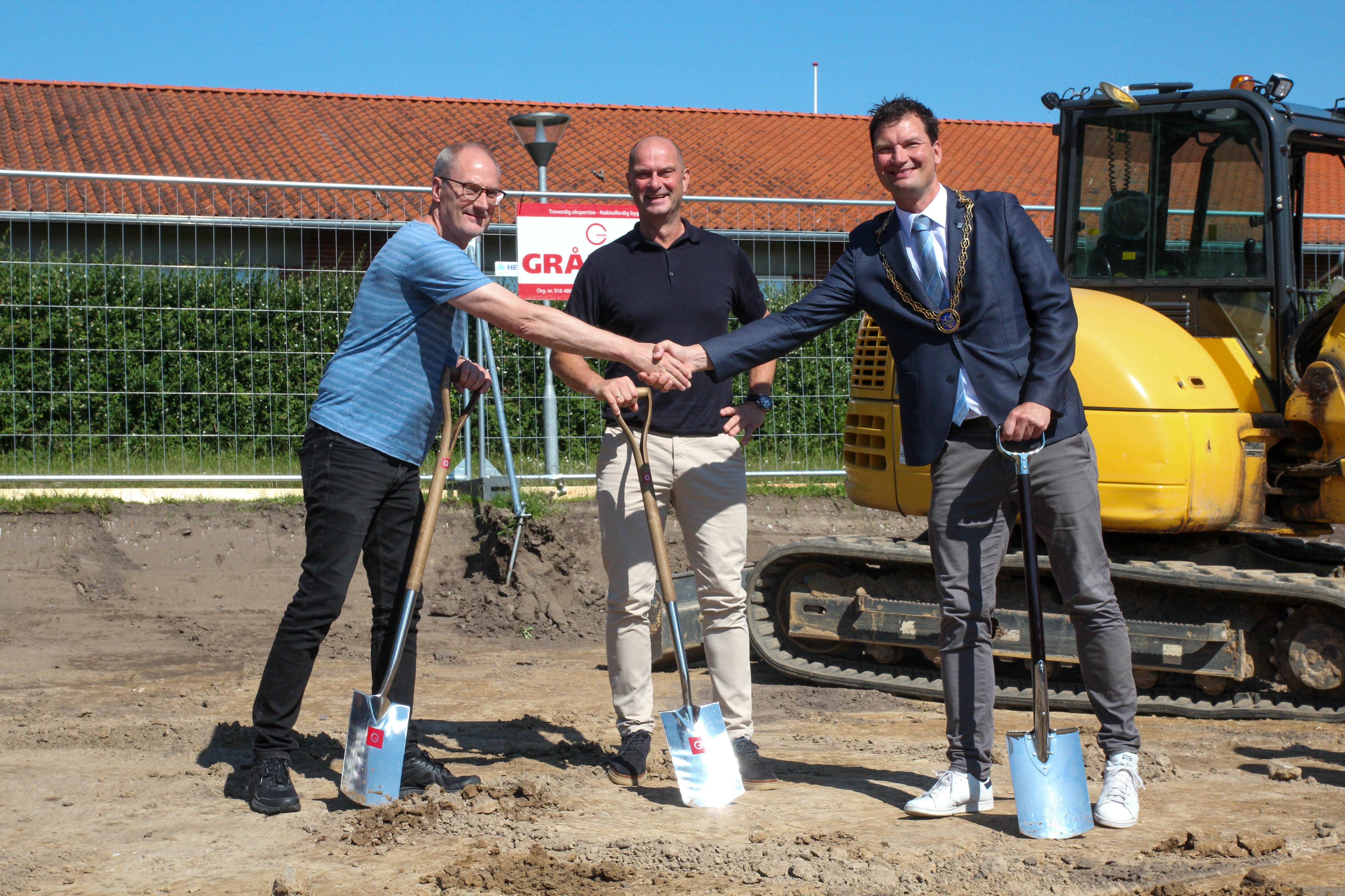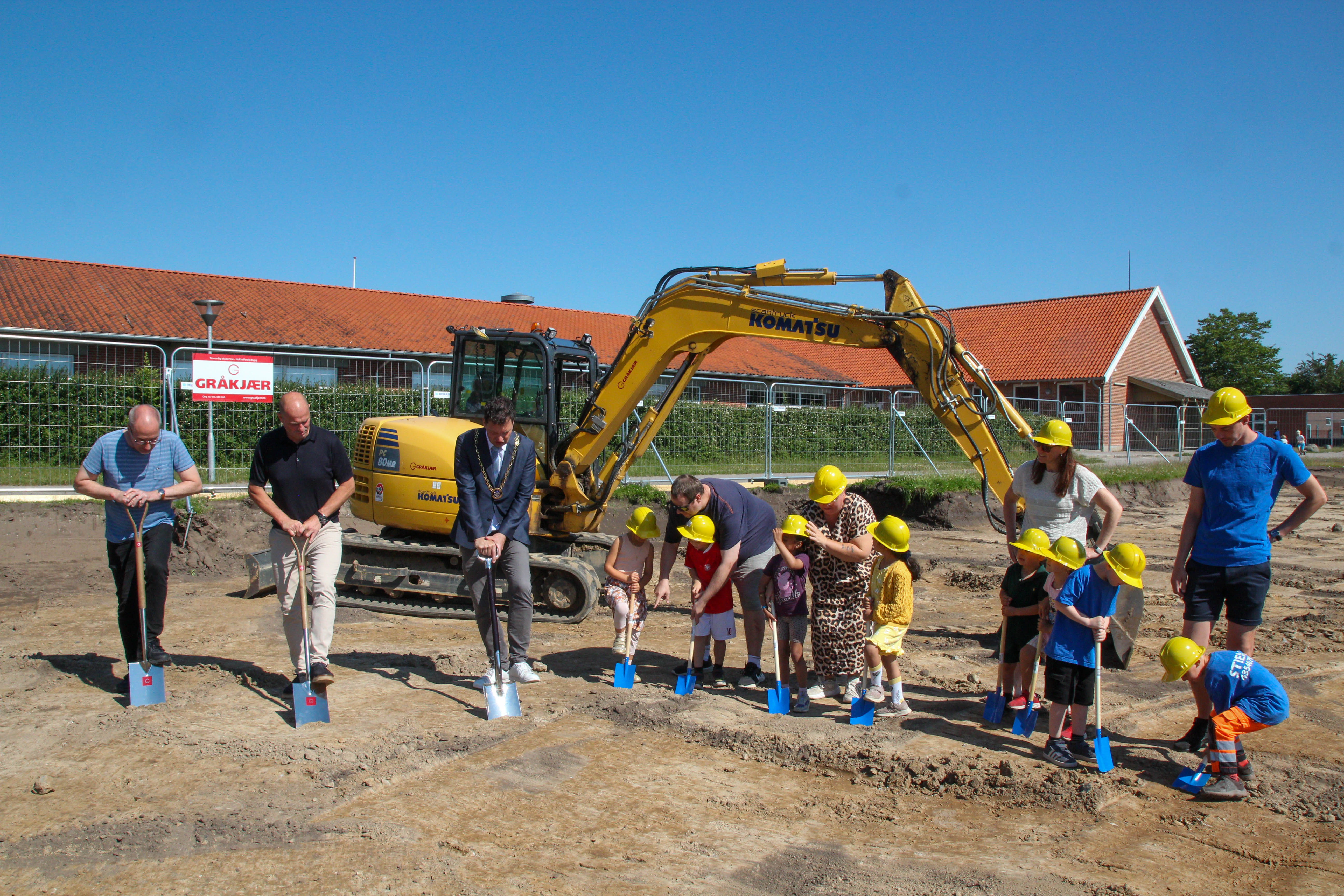 Borgmesteren fik sammen med direktør for Gråkjær Henrik Skaarup og projektleder ved Gråkjær Bjarne Edske god hjælp af otte frivillige børn til at tage det første spadestik. Også hos Gråkjær glæder man sig til at gå fra projektbeskrivelser og -tegninger til byggefasen.