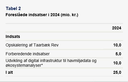 - Opskalering af genopretningen af Taarbæk Rev, som Miljøstyrelsen er i gang med. Den eksisterende bevilling rækker ikke til hele projektarealet, og derfor vil en opskalering sikre, at hele område bliver genoprettet.