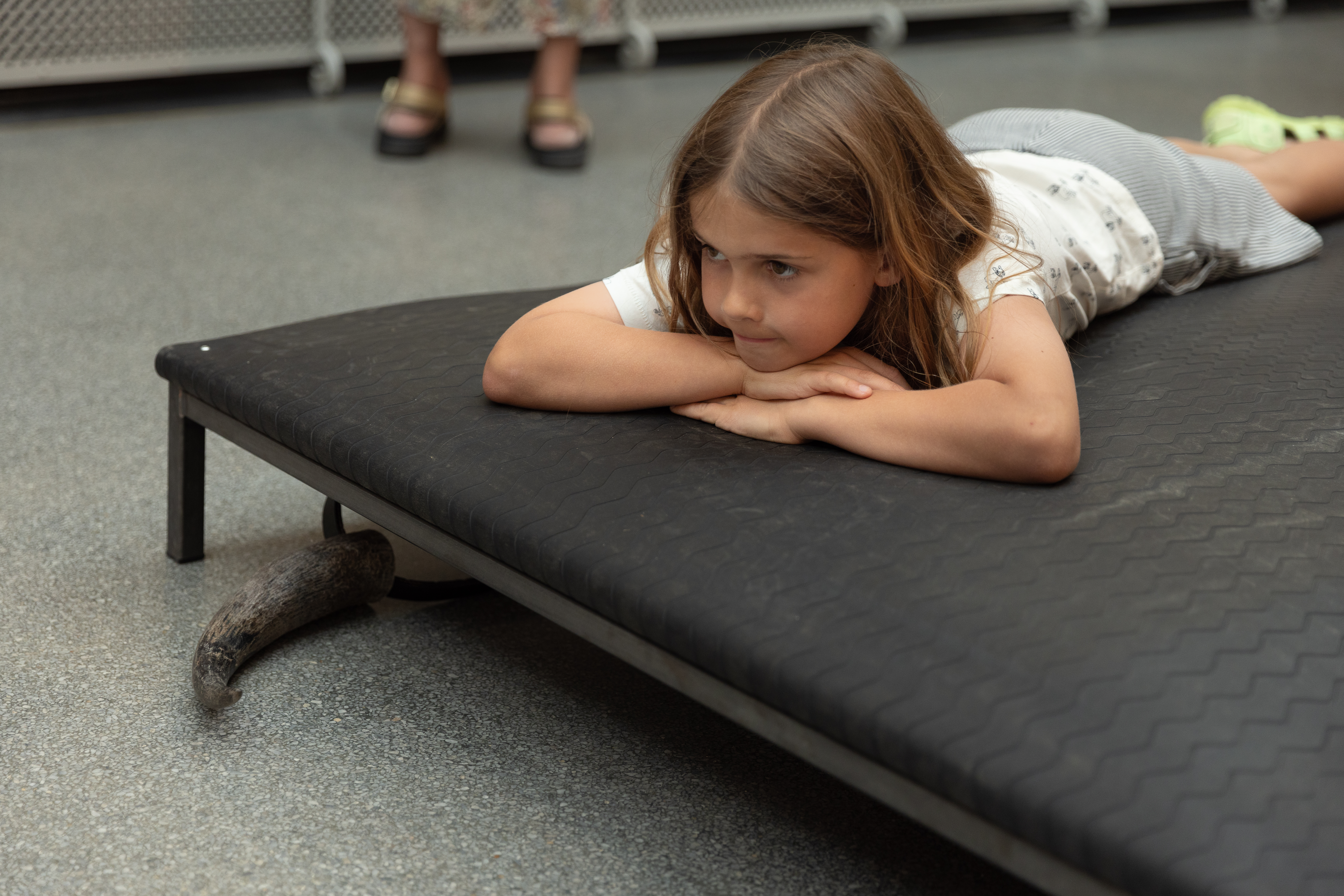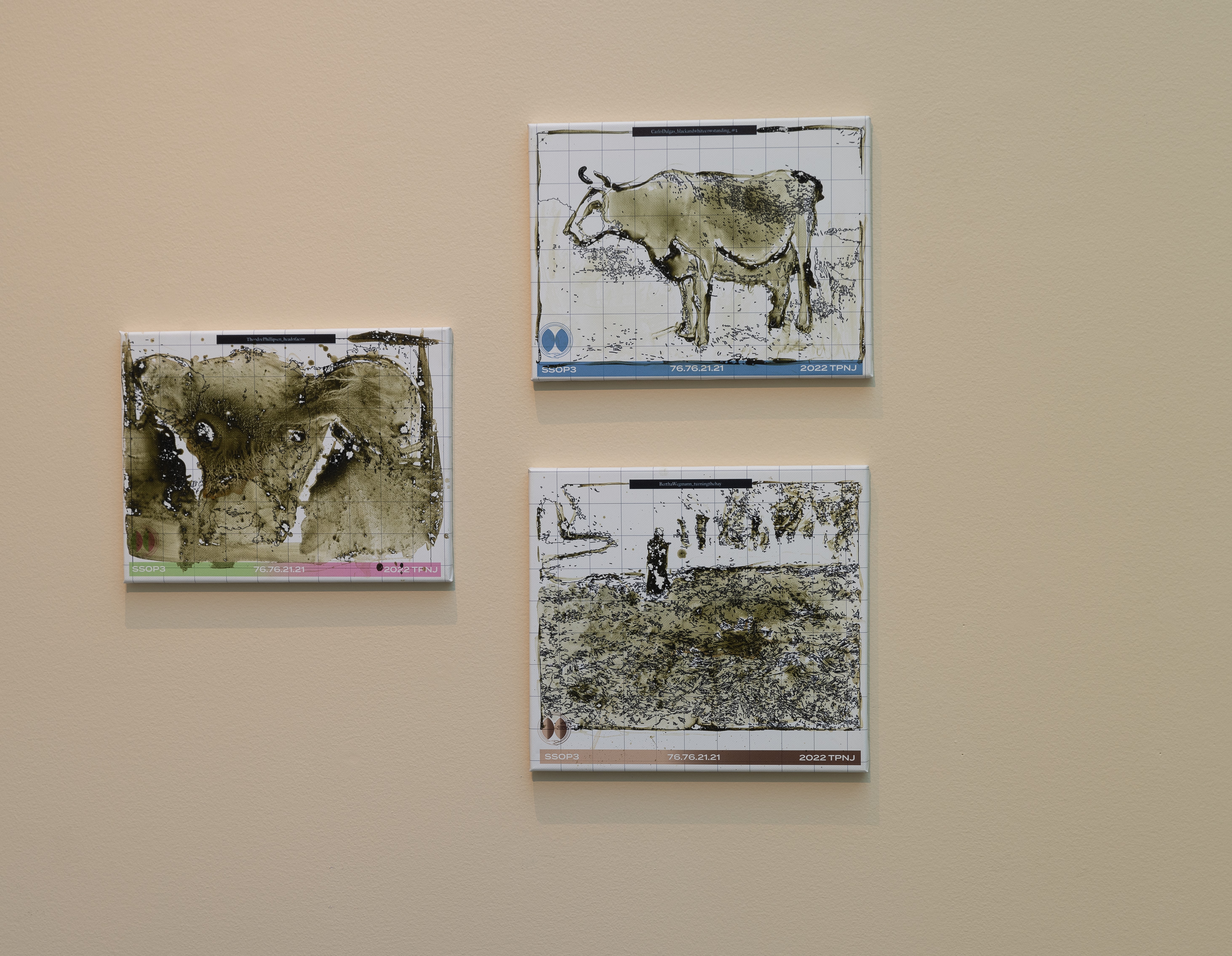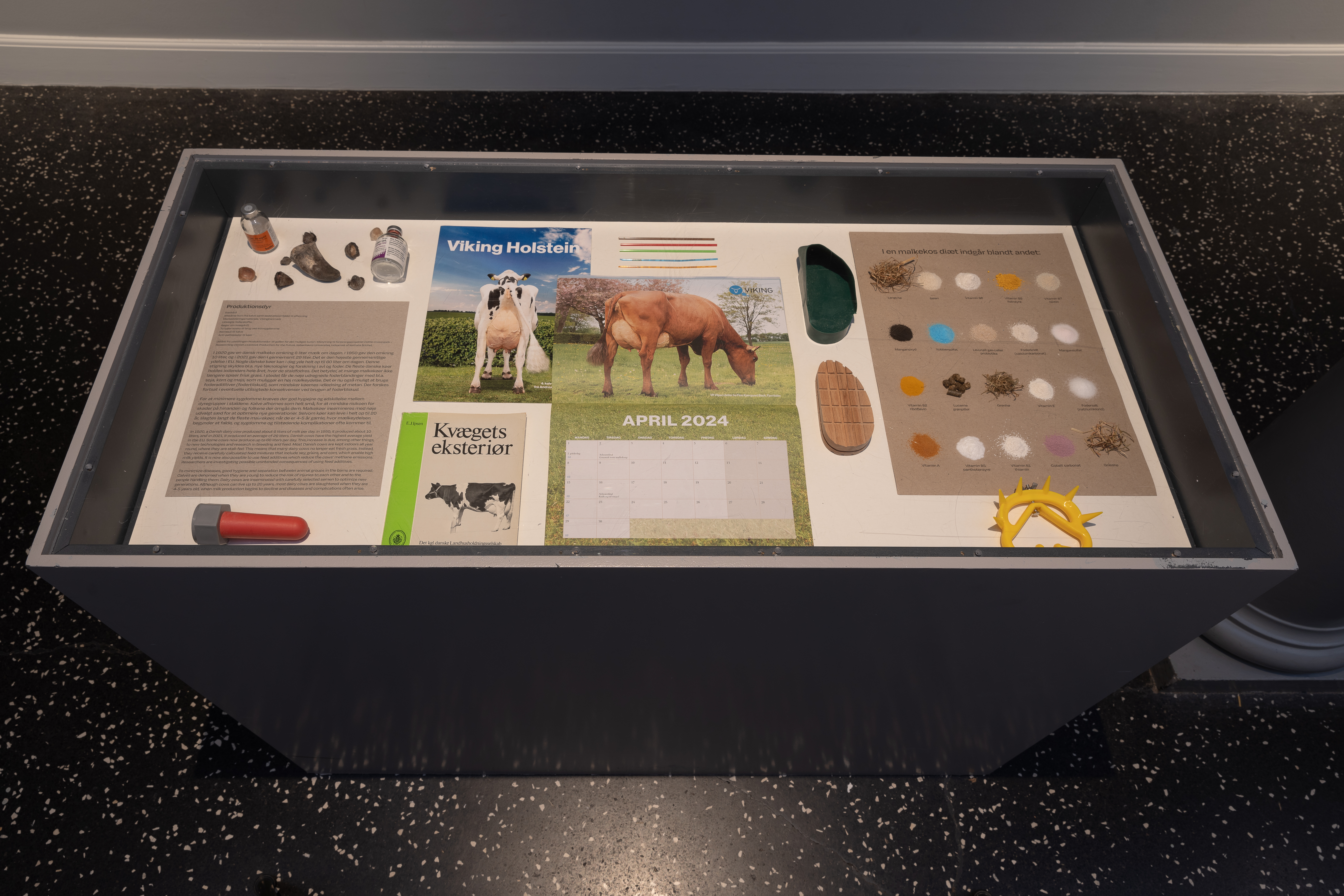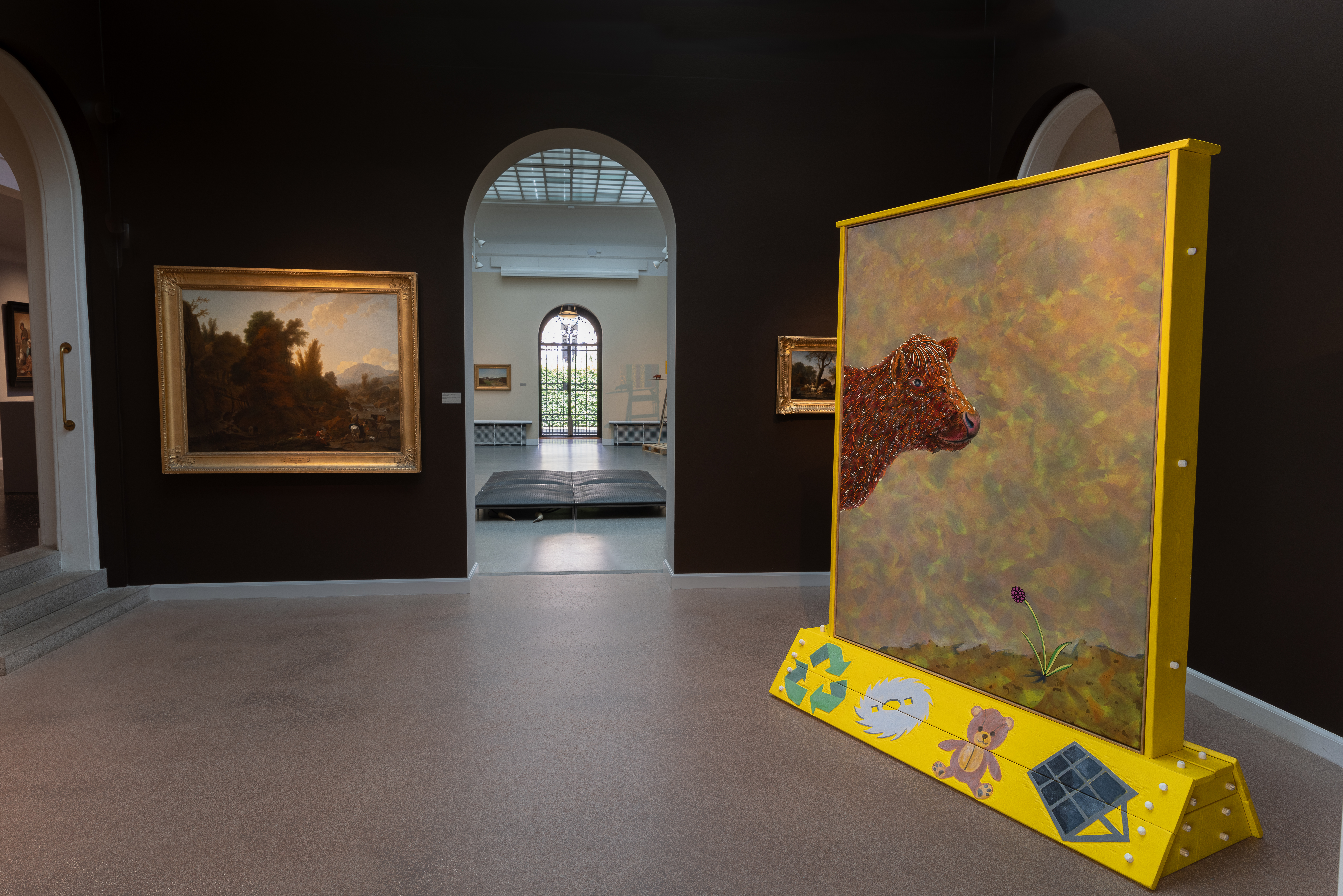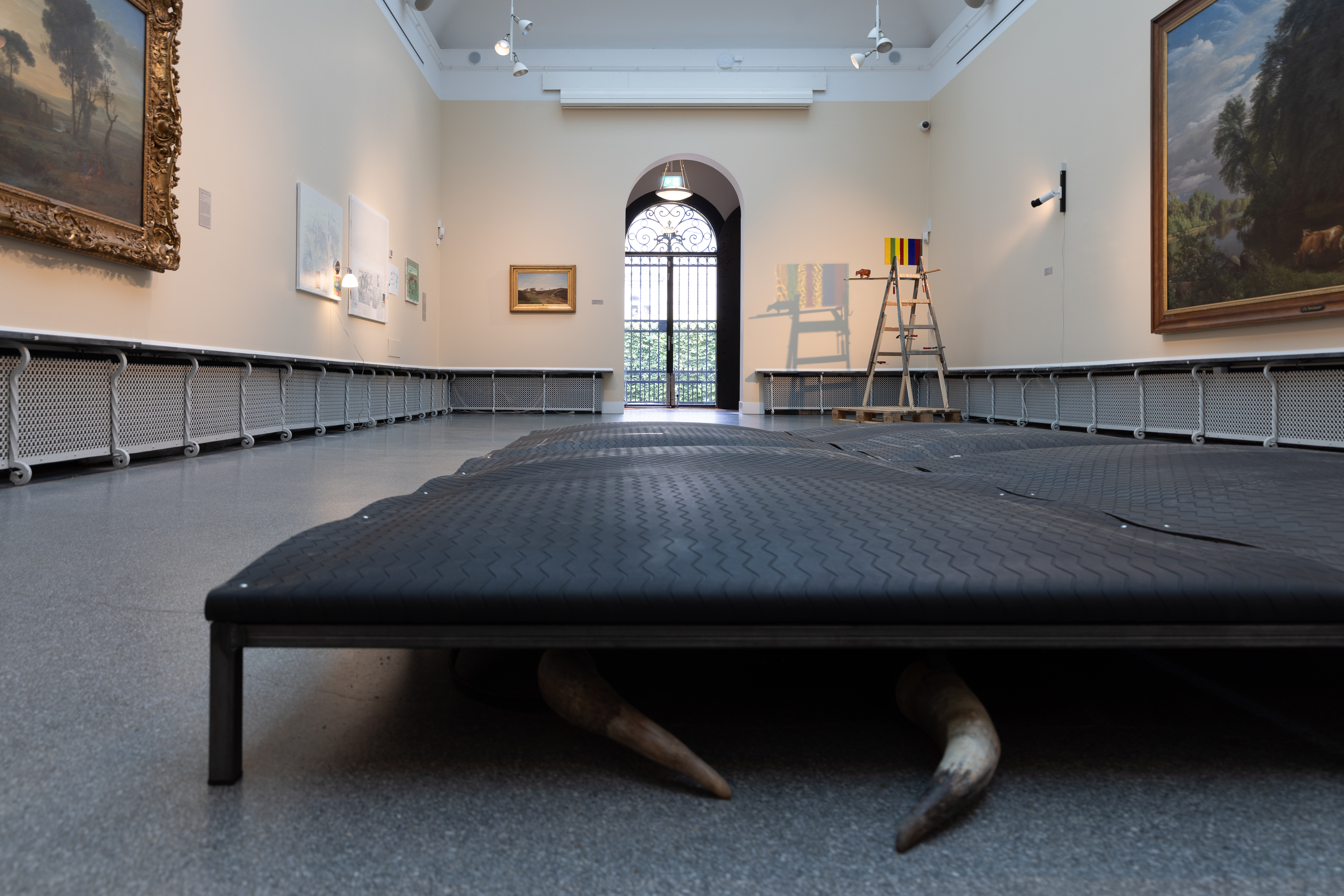 I kontrast til 1800-tallets billeder af køer på græs, tager Lea Porsagers værk Erasure beds (+ drooping horns) os helt tæt på køernes liv i landbruget i dag. Platformen er sammensat af fire ko-vandsenge, som bruges i industrilandbruget, hvor de danske malkekøer har ret til blødt underlag, lig madrasserne her, som de kan stå og ligge på i pauser fra de hårde indendørs betongulve. I Porsagers værk er koen nærmest krøbet ned under madrassen. Hornene refererer samtidig til det biodynamiske landbrug, grundlagt af Rudolf Steiner, der mente, at koens horn forbinder den til kosmisk energi. I dag afhornes de fleste køer i industrilandbruget.