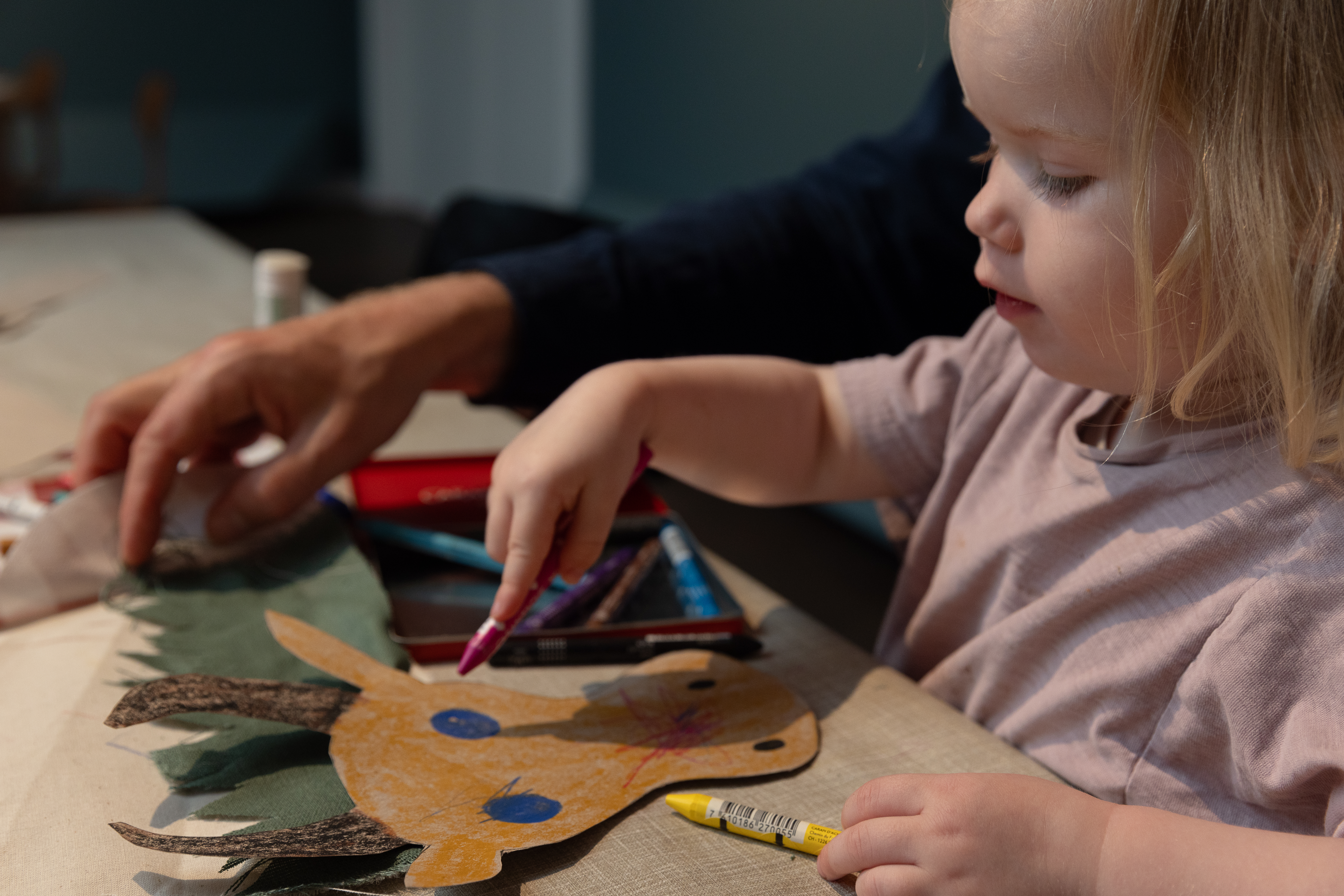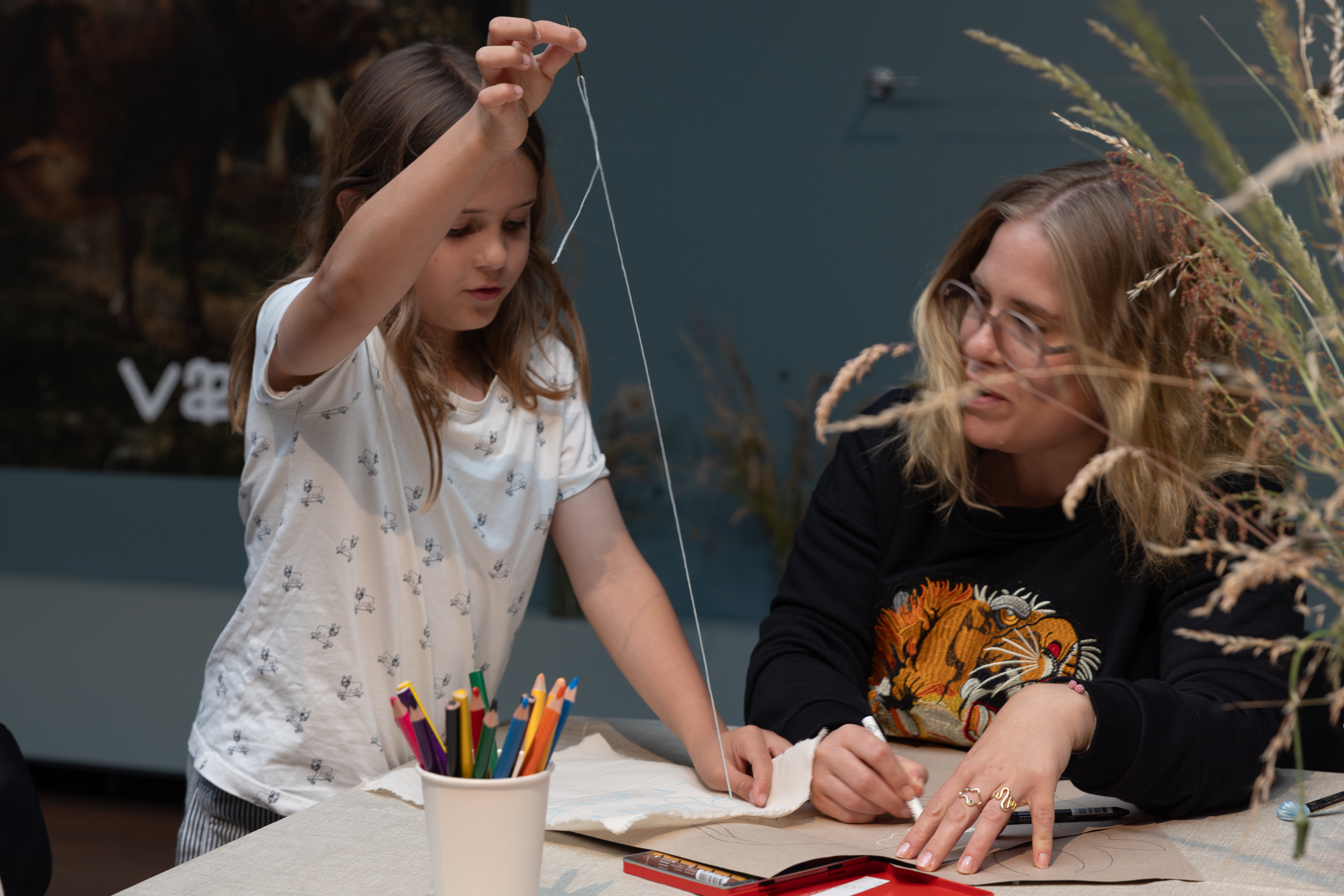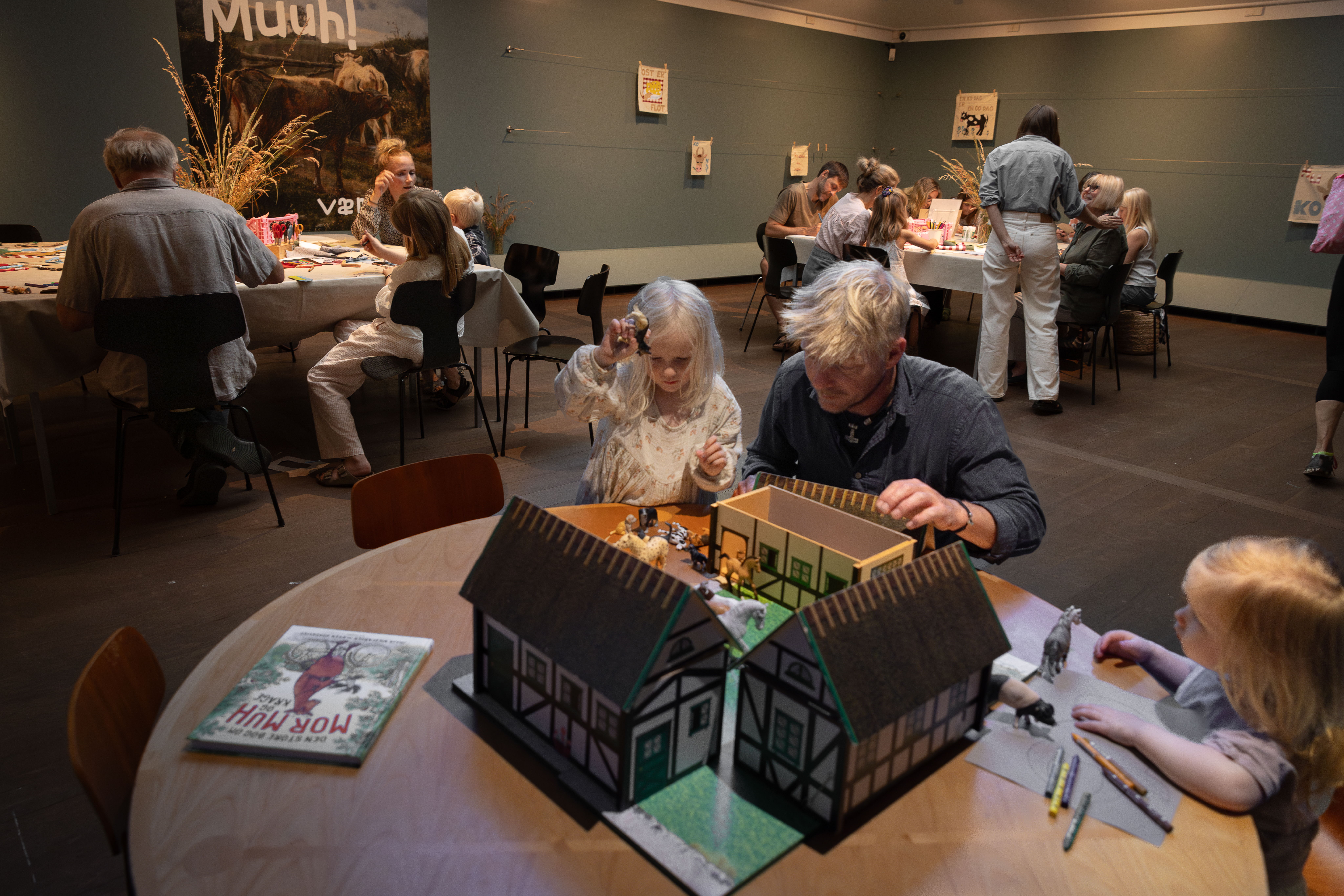I skolernes sommerferie vil der frem til søndag den 11. august være fri adgang til det kreative værksted MUUH! Her kan børn og voksne skabe deres egne tekstilcollager med ko-skabeloner, saks og lim, nål og tråd, inspireret af udstillingens ko-værker og de gamle mejerireklamer.