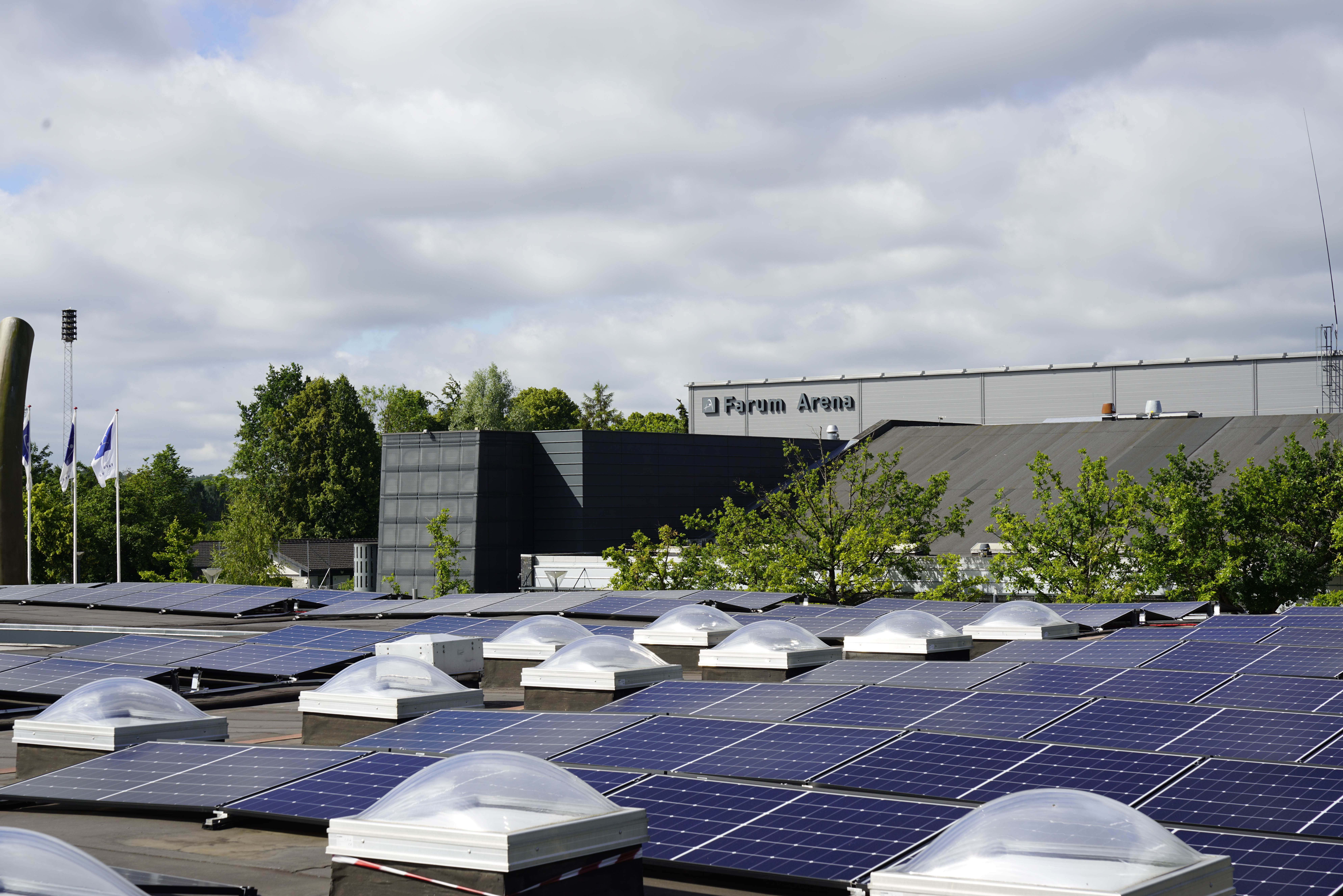 Solceller på taget af Stavnsholtskolen med Farum Arena i baggrunden