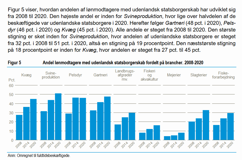 I virkeligheden drejer det sig kun om 52.500 arbejdspladser med fuldtidsbeskæftigede. Og for at det ikke skal være løgn, så er andelen af udlændinge hele 33 pct., og den stiger år for år. Dansk landbrug fungerer altså som et betydningsfuldt arbejdsanvisningskontor for udlændinge.