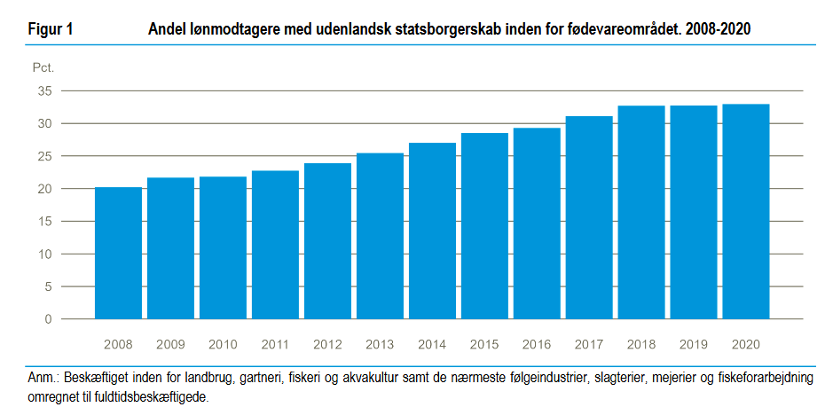 - I 2008 var 20 pct. af de 52.100 fuldtidsbeskæftigede lønmodtagere inden for fødevareområdet udenlandske statsborgere. I 2020 var andelen steget til 33 pct. og beskæftigelsen til 52.500 fuldtidsbeskæftigede.