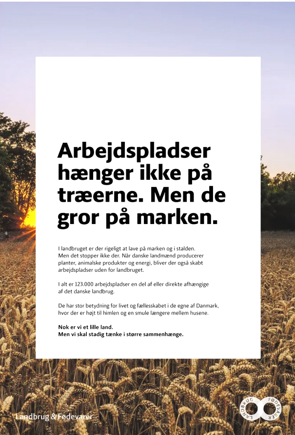 Hensigten med at spendere hundredtusinder af reklamekroner på helsides annoncer i aviserne var ikke til at tage fejl af. Budskabet til den grønne trepart lød: Hvis I vedtager en 'her-og-nu' afgift på klimaforurening fra landbruget, så kan det koste titusinder af jobs – eller som reklamefolkene bag kampagnen formulerede det: ”I alt er 123.000 arbejdspladser en del af eller direkte afhængige af det danske landbrug”.