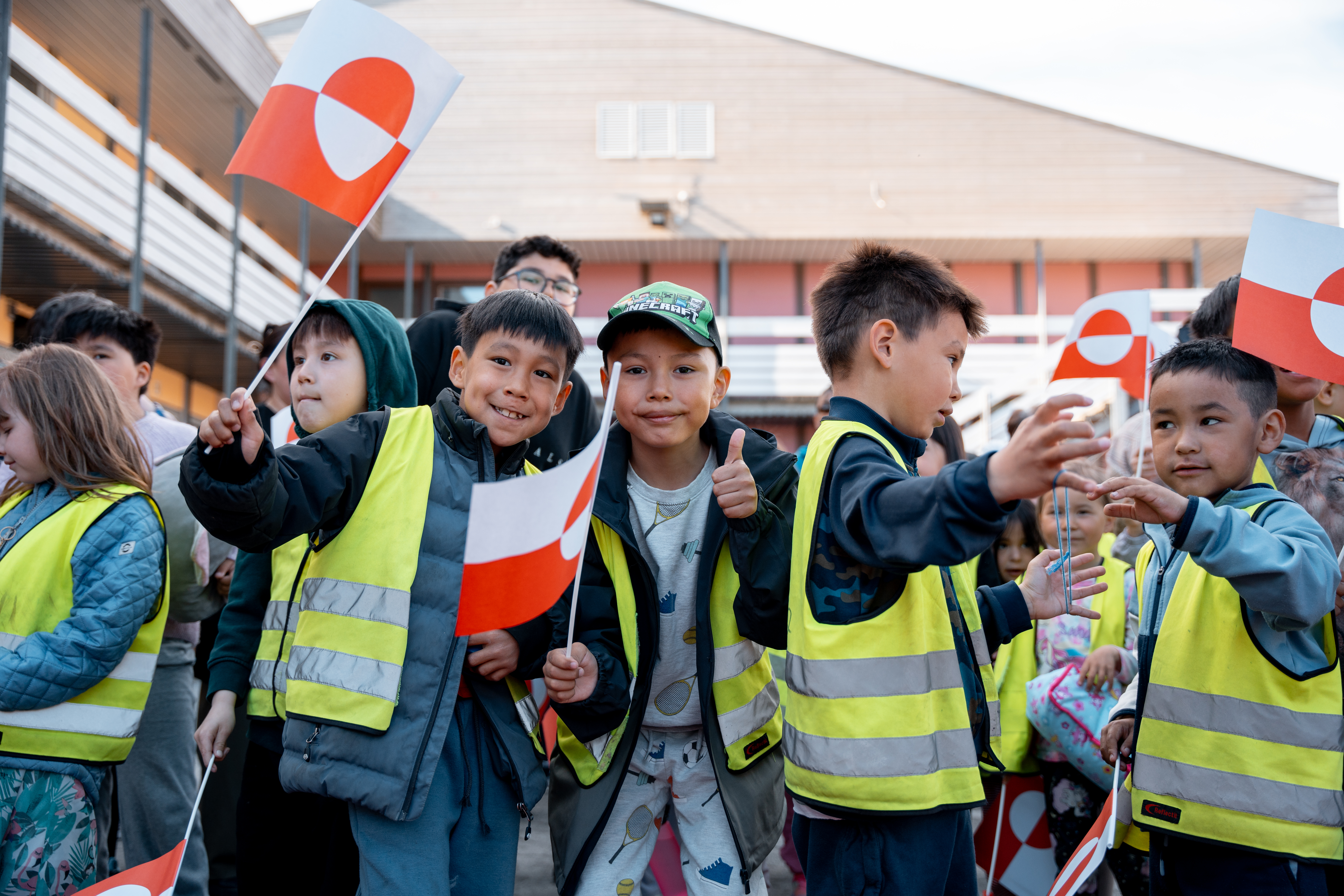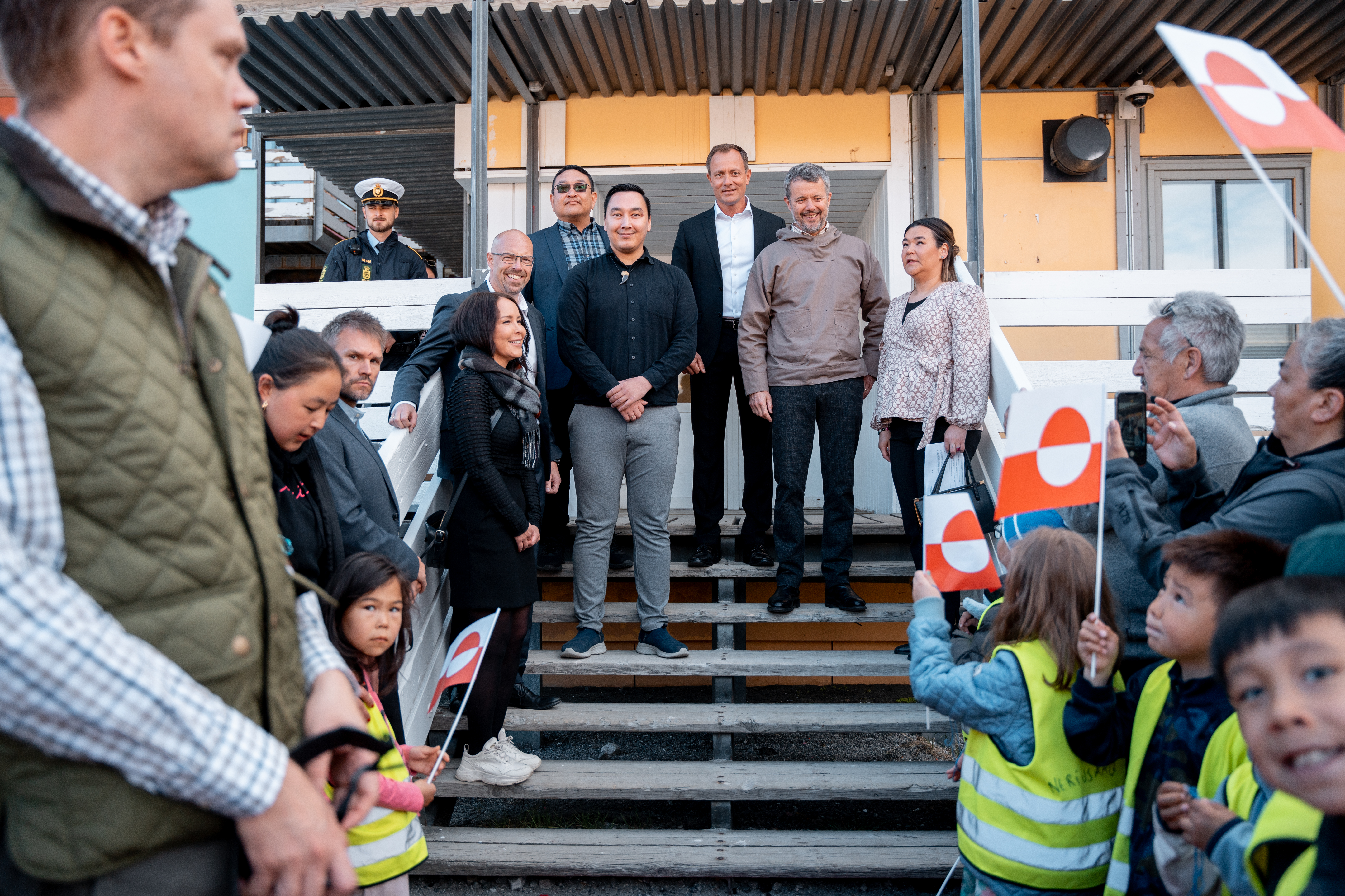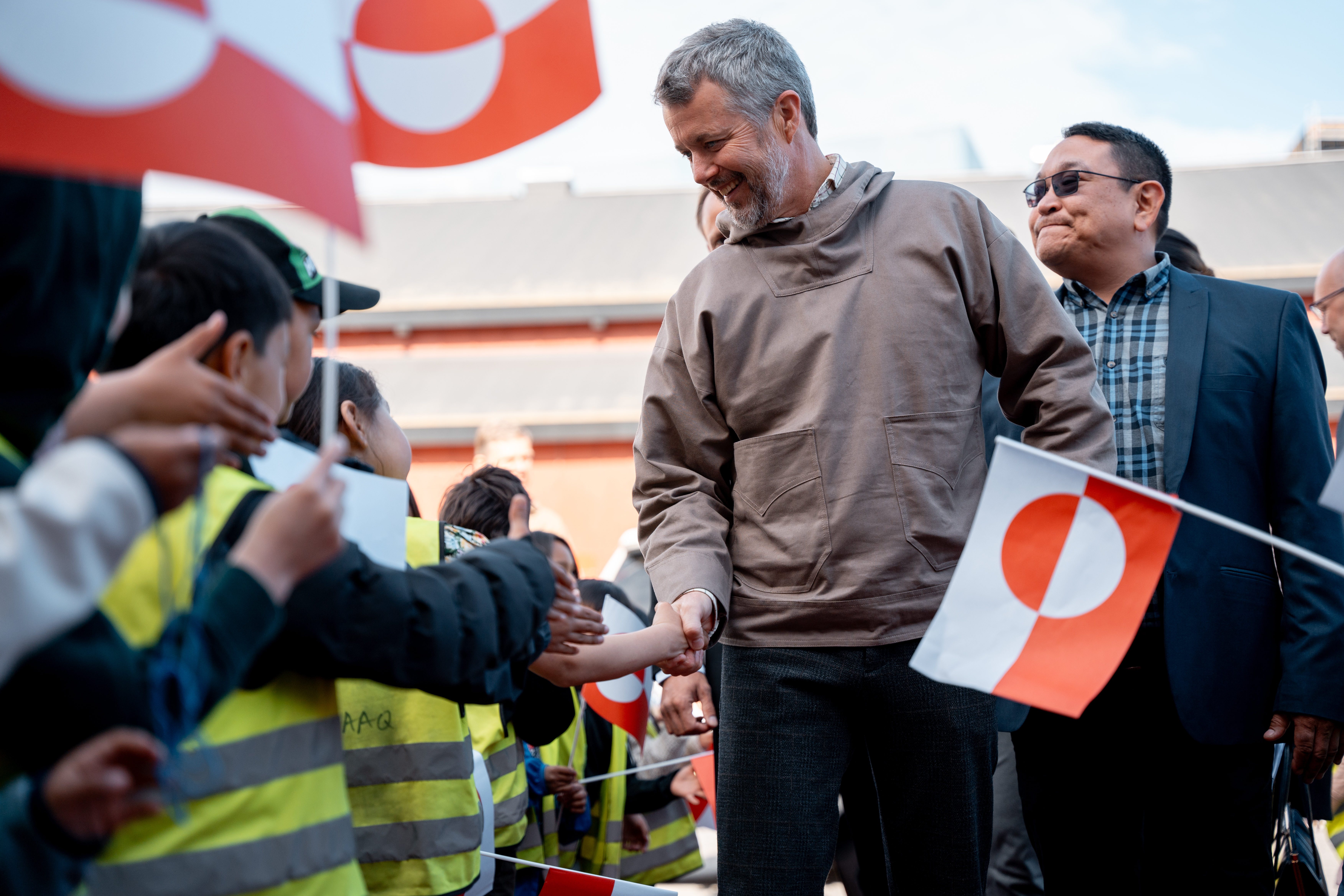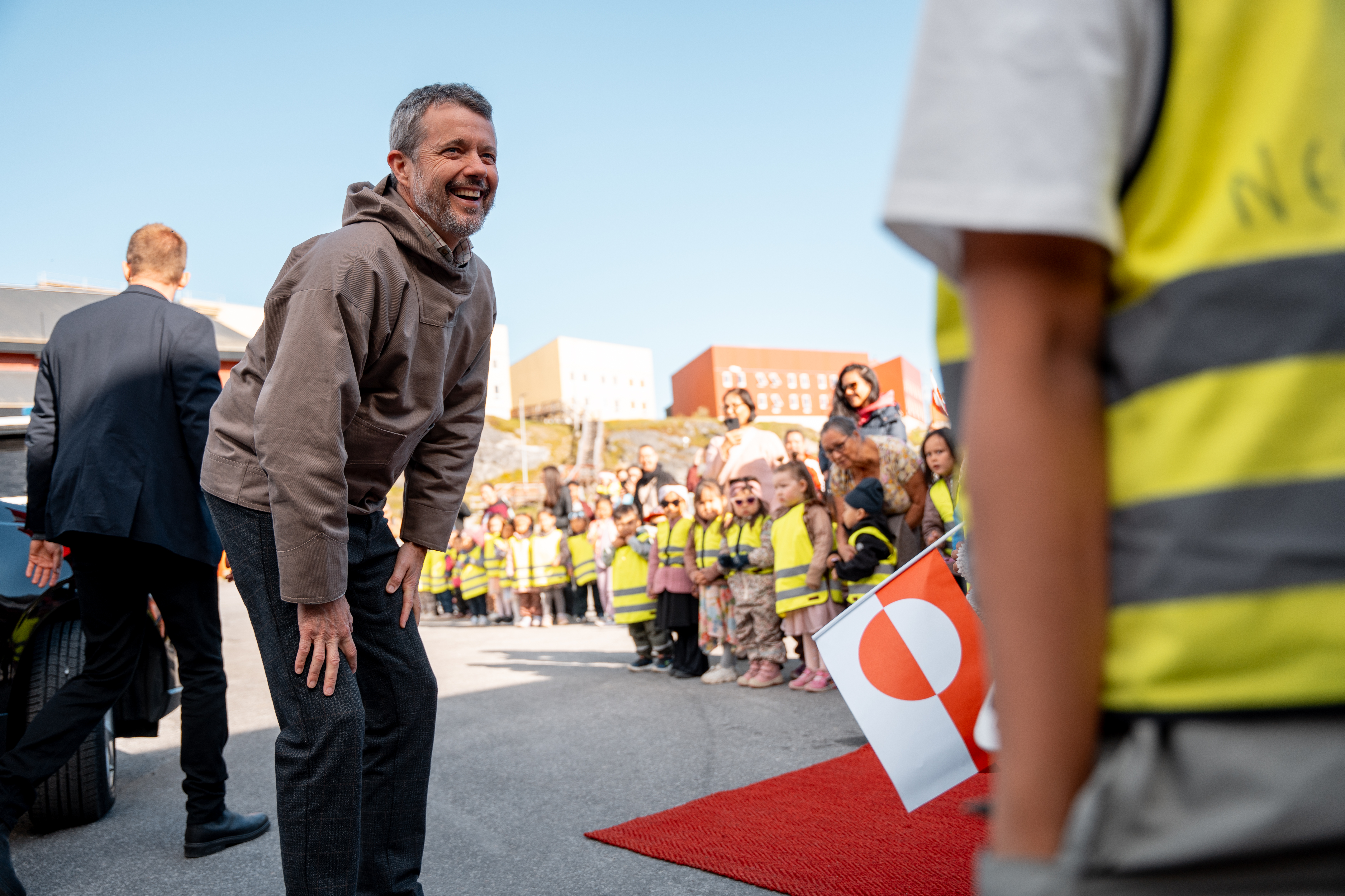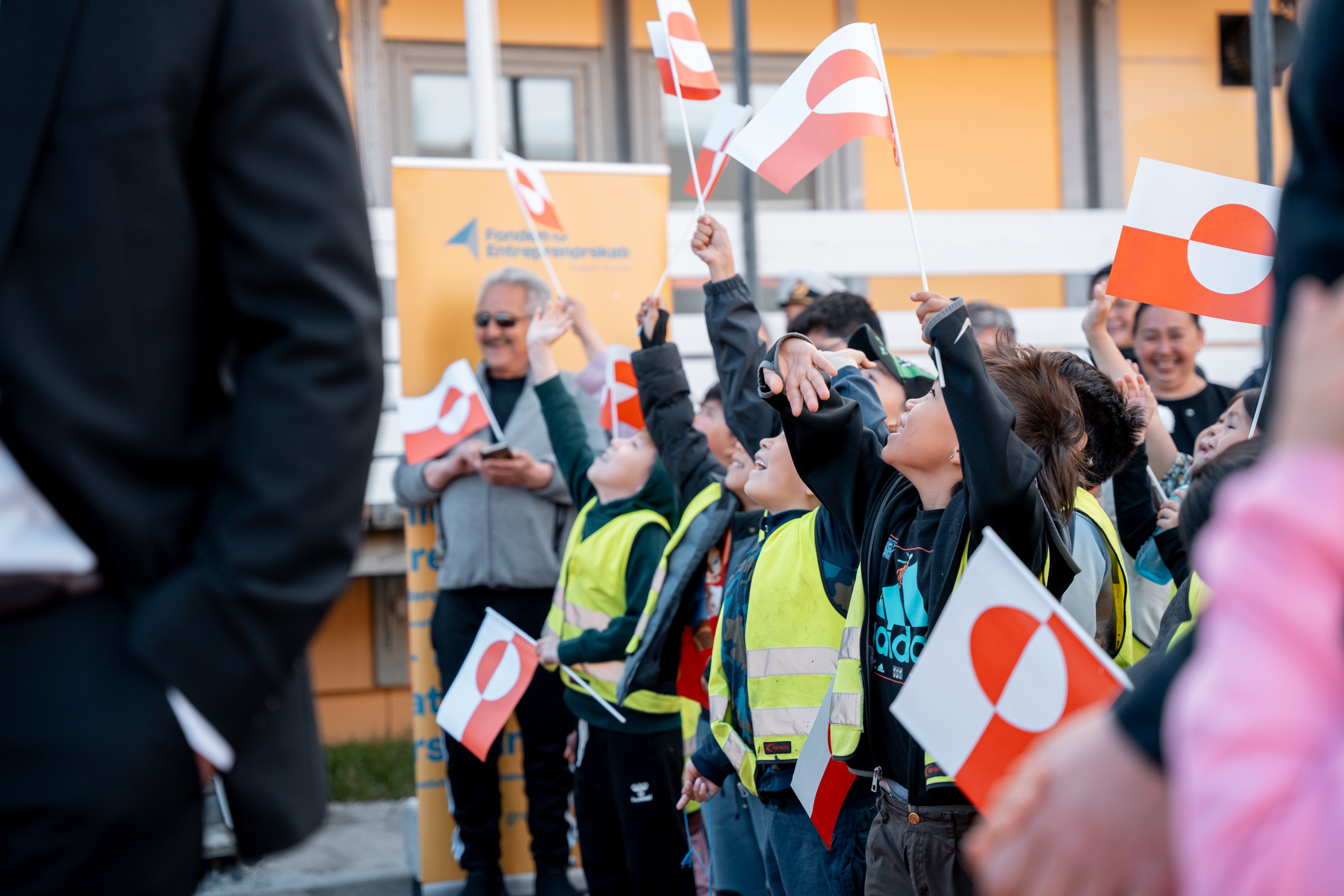 H.M. Kongen blev i dag modtaget af flagalle af børn fra en skole i Nuuk, da han besøgte unge iværksætterelever fra Nuussuup Atuarfia skolen. Det skete under Kongefamiliens besøg i Grønland, og de unge elever fik udover at hilse på Kongen mulighed for at præsentere deres iværksætterideer.