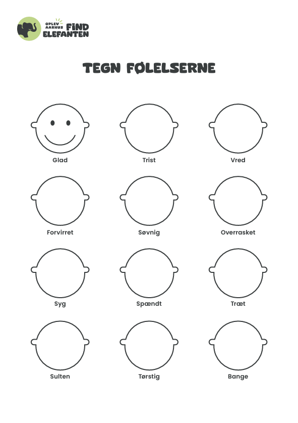 I kan fx finde aktiviteten 'Tegn følelserne', hvor alle kan tegne ansigter ud fra, hvordan de har det. I kan printe 'Hvor mærker jeg?' og bruge farver til at vise, hvor på kroppen, I mærker forskellige følelser. Andre aktiviteter er 'Ordleg' og 'Snabellabyrint', og så kan I male jeres helt egne elefanter med elefantskabelonerne.