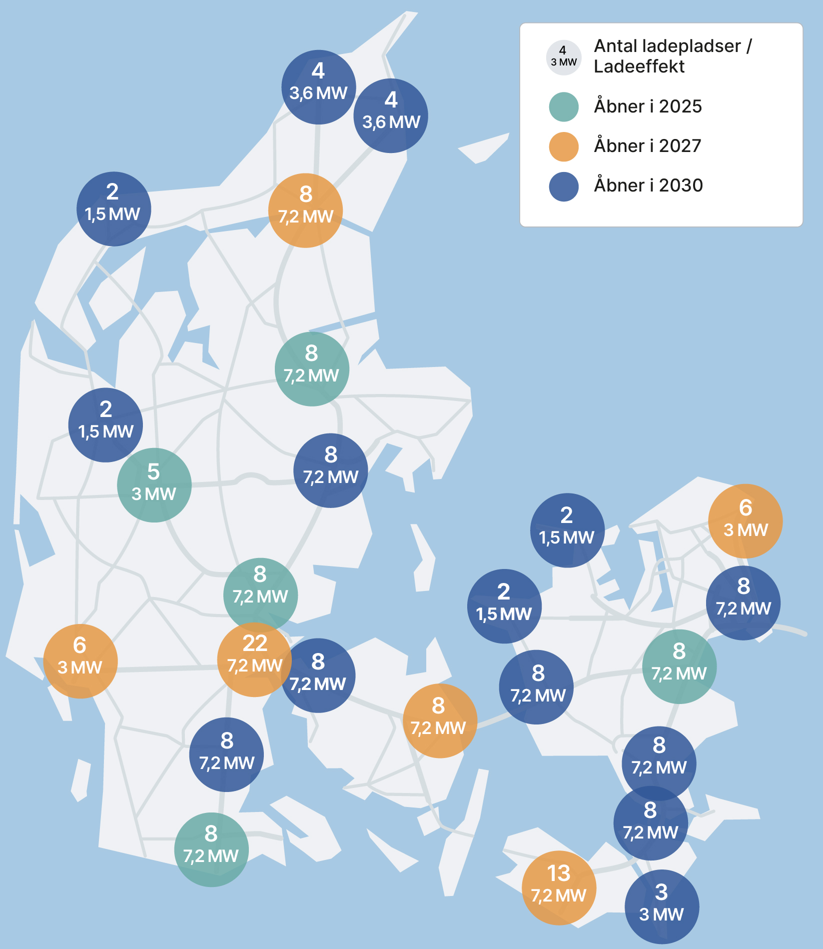 De første fem ladeparker åbner i 2025, mens de øvrige 20 ladeparker åbner i henholdsvis 2027 og 2030.