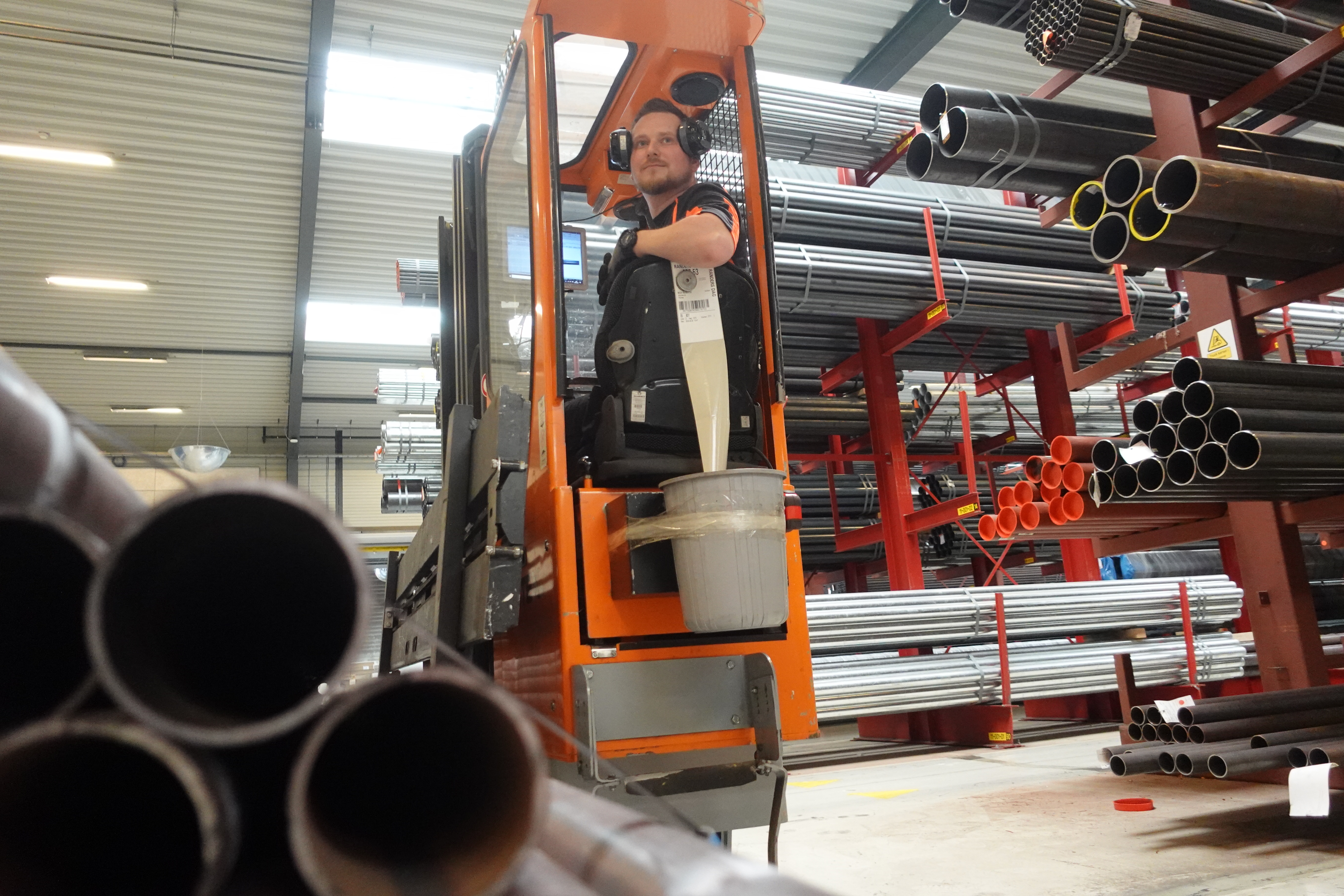 Nu er hylderne fyldt med stålrør i alle størrelser, der skal transporteres på en avanceret truck. Arbejdsopgaverne er mere krævende, da stålrørene bliver solgt til industrier, der skal have garanti for, at rørene er stærke nok. Serhii har derfor specialiseret sig i flere områder på lagrene, og han har udviklet sine kompetencer og fået ansvar.
