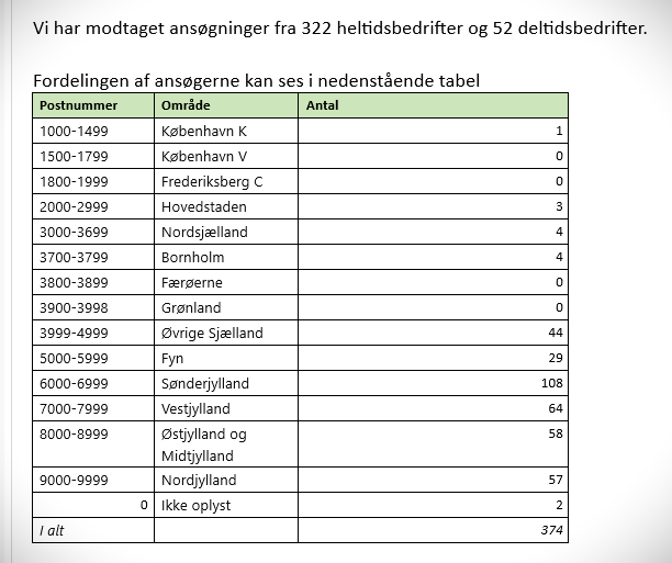 Landbrugsstyrelsen oplyser, at det drejer sig om 374 ansøgere, hvoraf de 322 ejer en heltidsbedrift og 52 en deltidsbedrift. Som det fremgår af tabellen over modtagne ansøgninger, så er der langt flere jyske bedrifter med 287 eller 77% af samtlige. Især Sønderjylland springer i øjnene med 108 eller 29% af samtlige ansøgere.