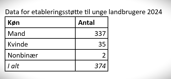 Dog er det ikke sådan, at de 241 mio. kr. er forbeholdt mænd, men reelt er det hankønnet, der scorer kassen. Landbrugsstyrelsen oplyser, at kun 35 af de 374 ansøgere er kvinder, dvs. 91% er mænd, så ministerens sprogvalg er ikke helt ved siden af.