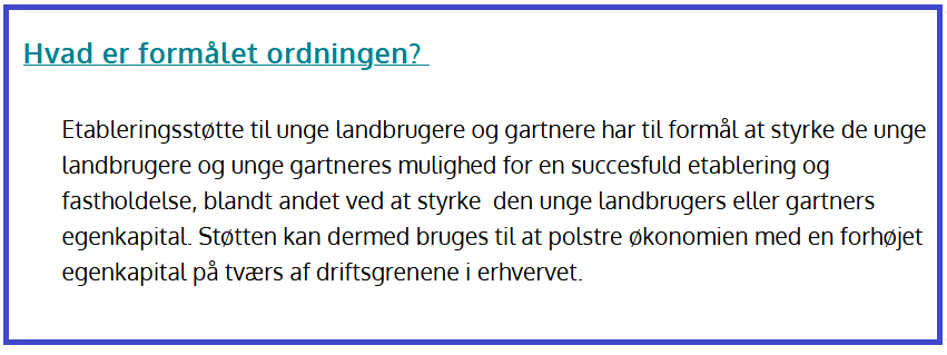 ”Landbrugsstyrelsen kan give tilskud til, at unge landbrugere eller unge gartnere etablerer sig med en landbrugsbedrift eller et gartneri.”