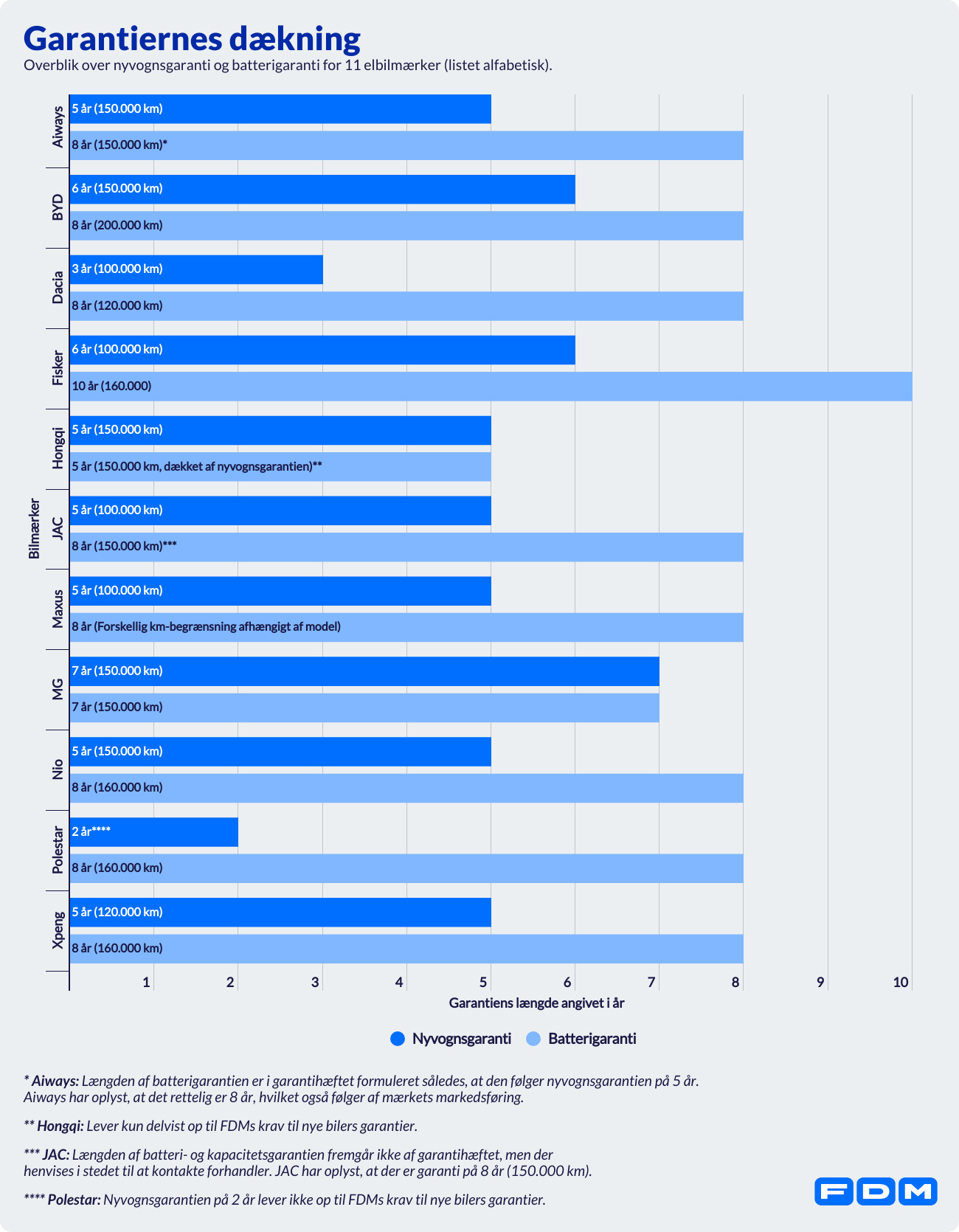 For hvor de velkendte europæiske bilmærker med få undtagelser spiser forbrugerne af med to års garanti, har de nye elbilmærker typisk fem års garanti eller mere, mens batterigarantien ligger på mellem 7 og op til 10 år. Det viser en stor gennemgang af de nye elbilmærkers garantier, som FDM har lavet.
