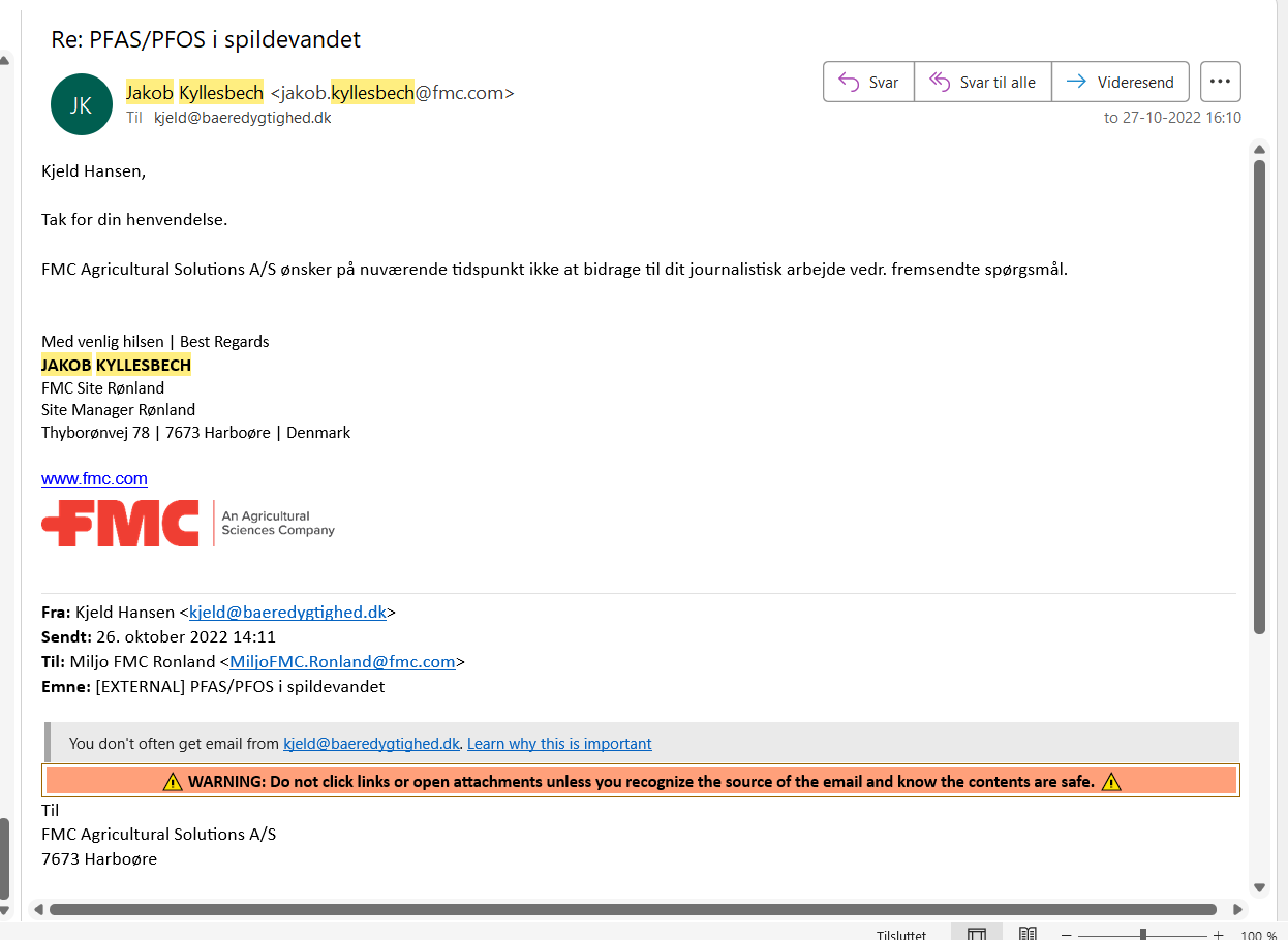 Allerede i 2022 afviste FMC-fabrikkens direktør enhver form for offentlighed. ”FMC Agricultural Solutions A/S ønsker på nuværende tidspunkt ikke at bidrage til dit journalistiske arbejde”, skrev direktør Jakob Kyllesbech i oktober 2022 til redaktionen.