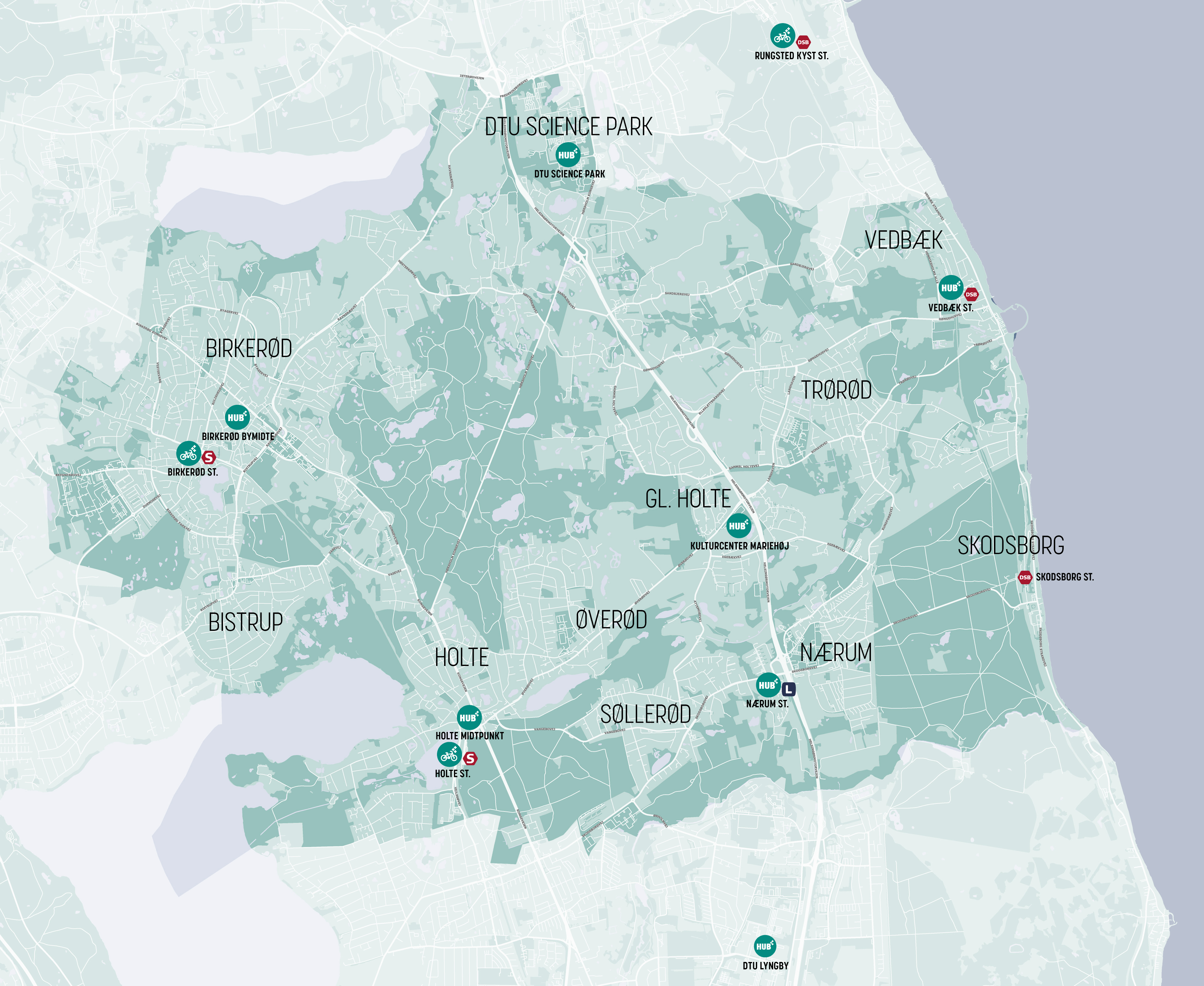 Uden for Rudersdal Kommune etableres supplerende HUBs følgende steder: