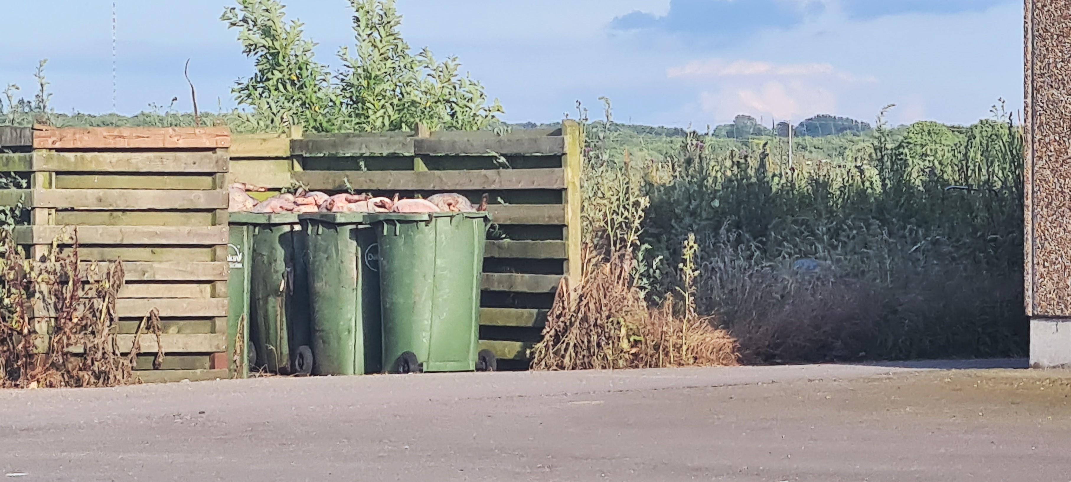 Overfyldte skraldespande med rådnende svinekadavere udenfor svinekødsfabrikken på Valmosevej 9A, 4160 Herlufmagle. Foto: Miljøforeningen for Rislev og Nedre Suså