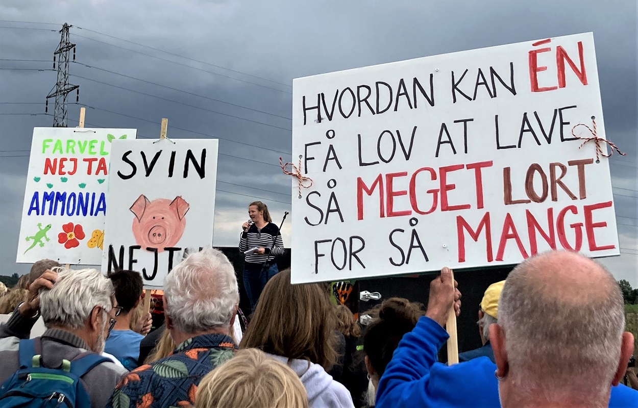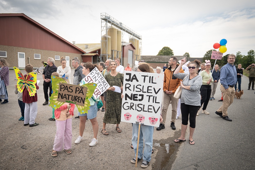 I august 2023 var Tybjerggård målet for en større demonstration fra de lokale beboere i Rislev, hvor 175 børn og voksne gik med i en demonstration med en ren skilteskov med protestbudskaber for at få stoppet byggeriet af endnu en fabrik. Svinekødsproducenten havde fået Næstved Kommunes miljøgodkendelse til at opføre en ekstra fabriksbygning blot 30 meter fra den eksisterende. Fidusen var kendt som CVR-finten, og ifølge Greenpeace ville den betyde mere ammoniakforurening af en sårbar og beskyttet natur, større lugtgener, larm og tung trafik. Foto: Greenpeace
