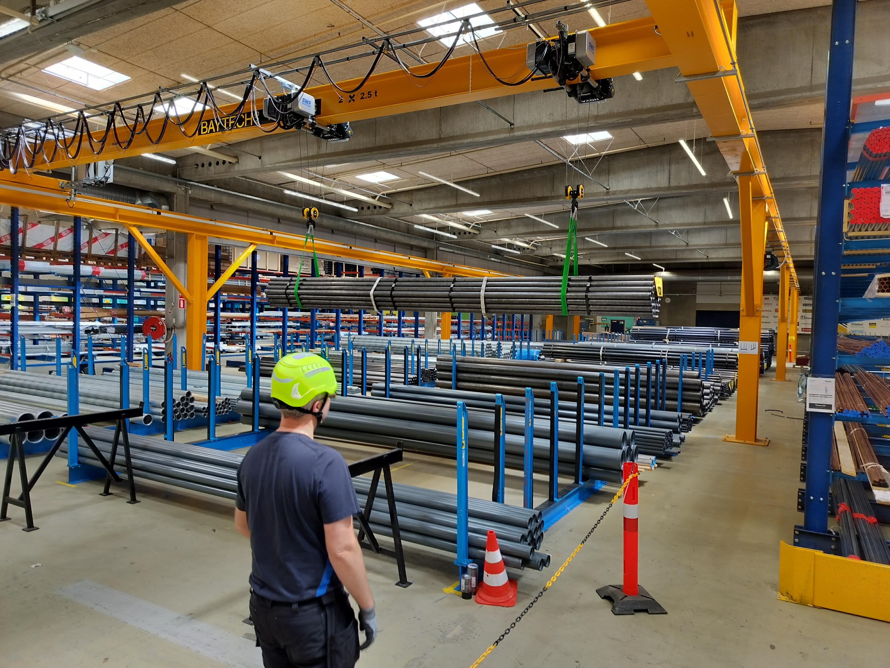 Det kræver et særligt setup at håndtere sprinklere. Rørene er tunge og op til seks meter lange. Samtidig kommer de i mange varianter - fx sorte, galvaniserede og coatede rør - og i forskellige godstykkelse og med forskellige godkendelser. Nogle kræver en mere nænsom håndtering og skal bundtes med bølgepap og båndstrammer, så overfladen ikke beskadiges.