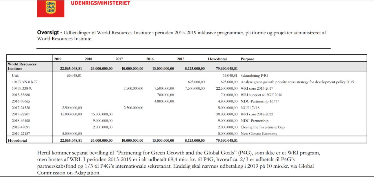 Om det er sandt, vides ikke, men en simpel aktindsigt afslører, at den danske regering til og med 2017 støttede WRI med 7,5 mio.kr. om året, mens Løkke Rasmussen-regeringen fordoblede støtten til 15 mio. kr. fra og med 2018. Andre velinformerede kilder dokumenterer også, at Lunde Larsen selv havde forberedt det markante karriereskifte under flere USA-besøg hos WRI, bl.a. i december 2017 hvor han gav et foredrag for WRI-medarbejderne og afholdt møder med WRI-direktøren.