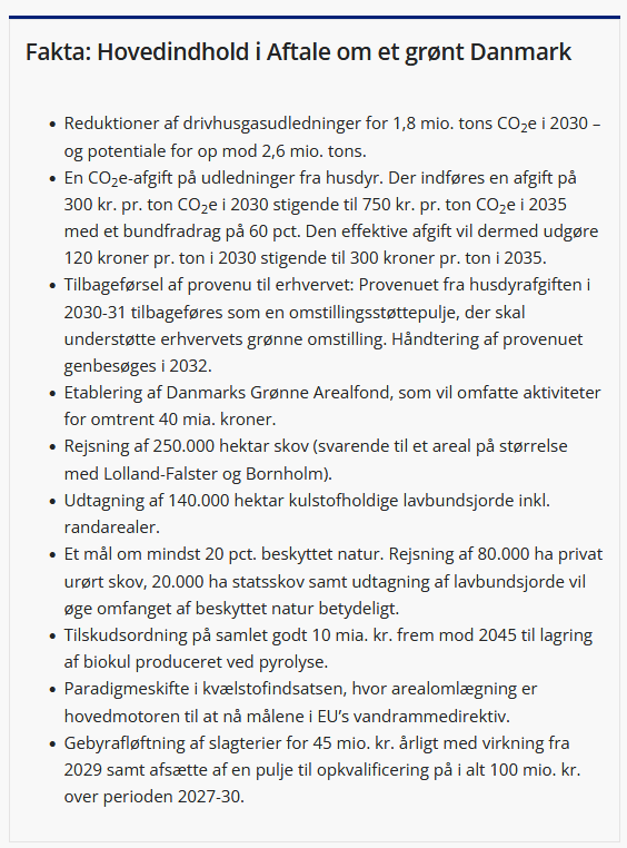 ”Med dagens aftale investerer vi milliarder i den største omstilling af det danske landskab i nyere tid. Vi skaber meget mere natur, renere vandmiljø, rejser meget mere skov og gør det muligt at udvikle landbruget til fremtidens grønne konkurrence. Samtidig bliver vi første land i verden med en CO2-afgift på landbruget. Det er endnu et eksempel på, hvad vi kan udrette, når vi fører politik hen over midten.”