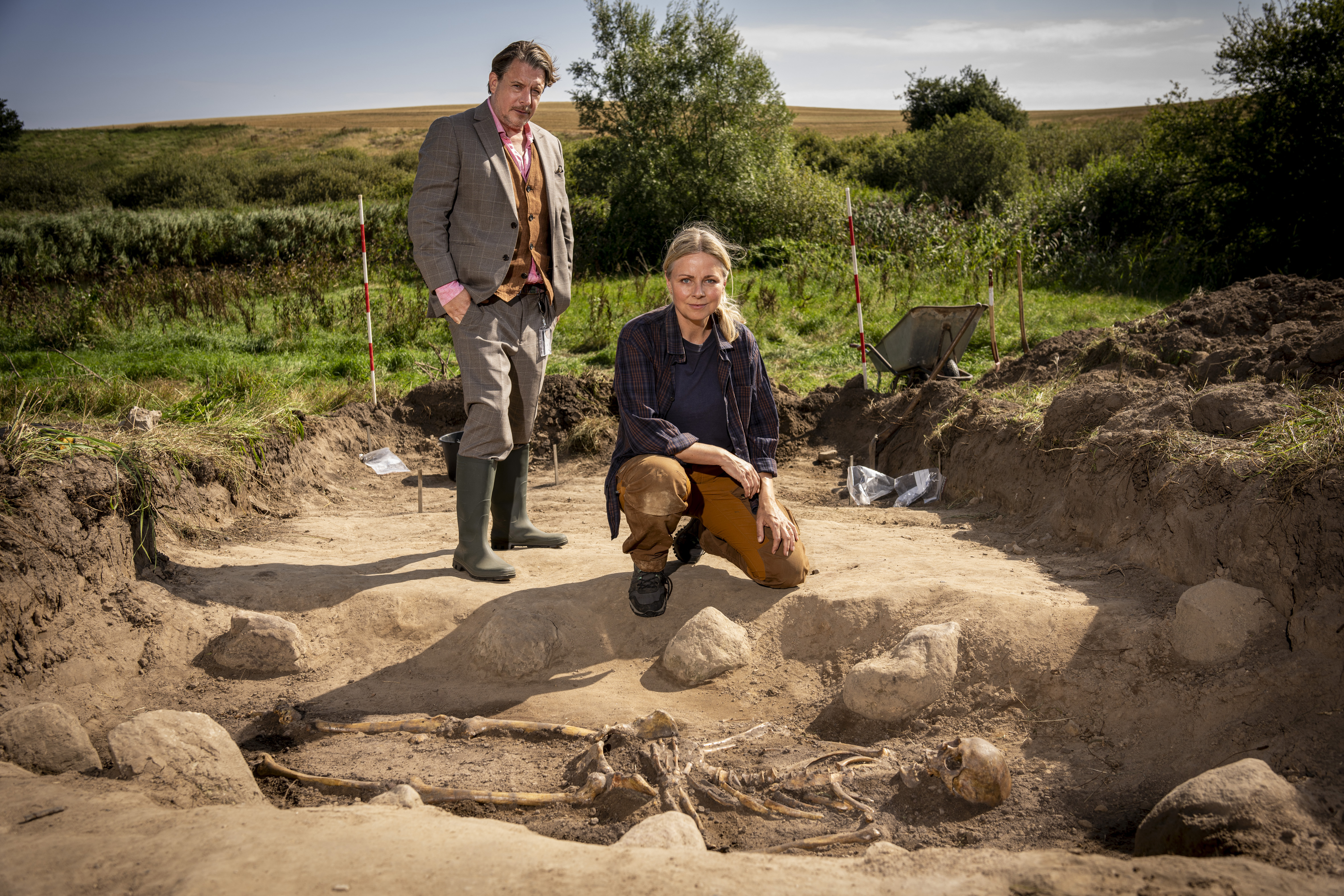 - 'Danefæ' er en varm og underholdende fortælling, der i sin kerne handler om et ægteskab, der ændrer sig fuldstændigt. Samtidig byder serien på et nyt blik på vores fælles historie, og vi inviterer bogstaveligt talt danskerne med ind - og ikke mindst med ned - i den fascinerende proces, det er at grave i fortiden, siger seriens producere, Stinna Lassen og Claudia Saginario fra Uma Film.