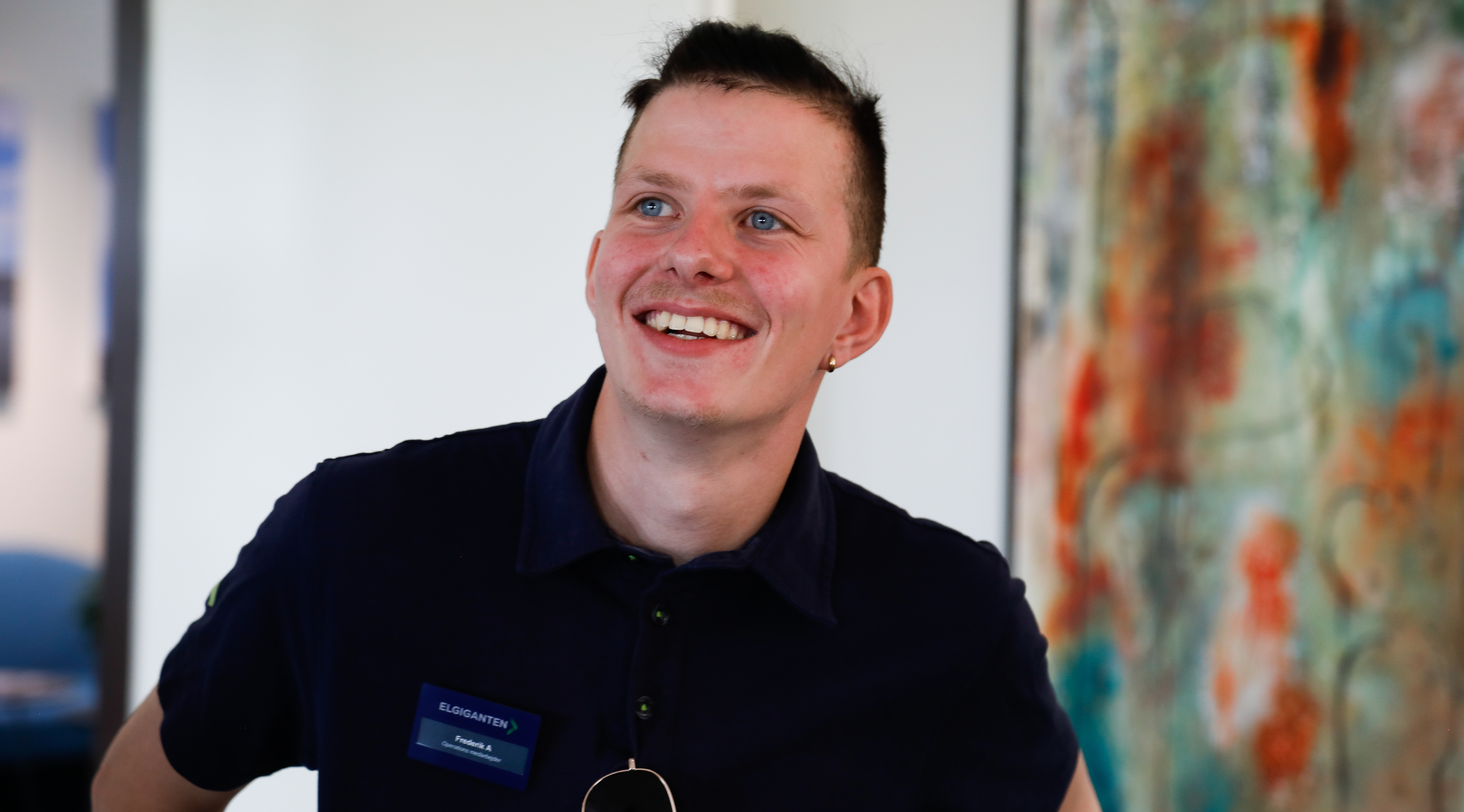 Det er Jens Romundstad, som er kommunikations- og relationskonsulent i KLAR TIL START, der siger ordene – du er jo guld værd - til Frederik Andersen, der efter et kompetencegivende forløb, som kan give borgere med autisme mulighed for et fast job i en helt almindelig virksomhed, nu arbejder i Elgiganten.