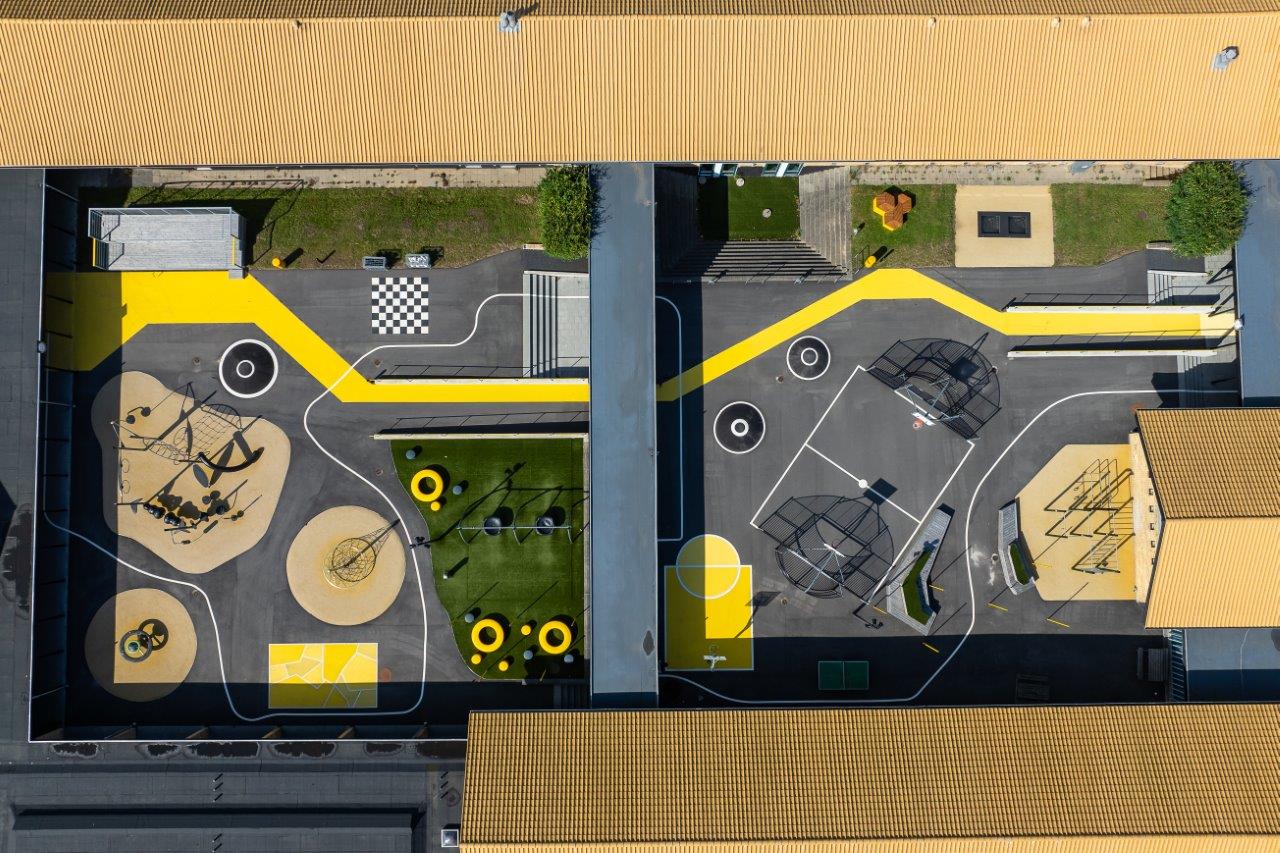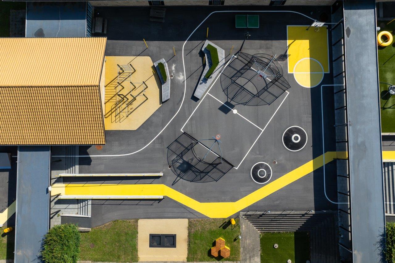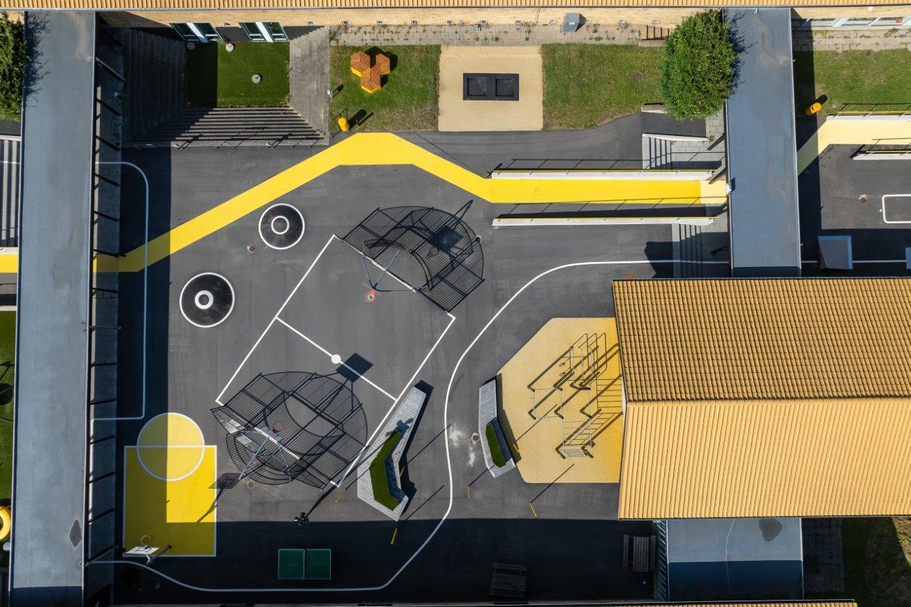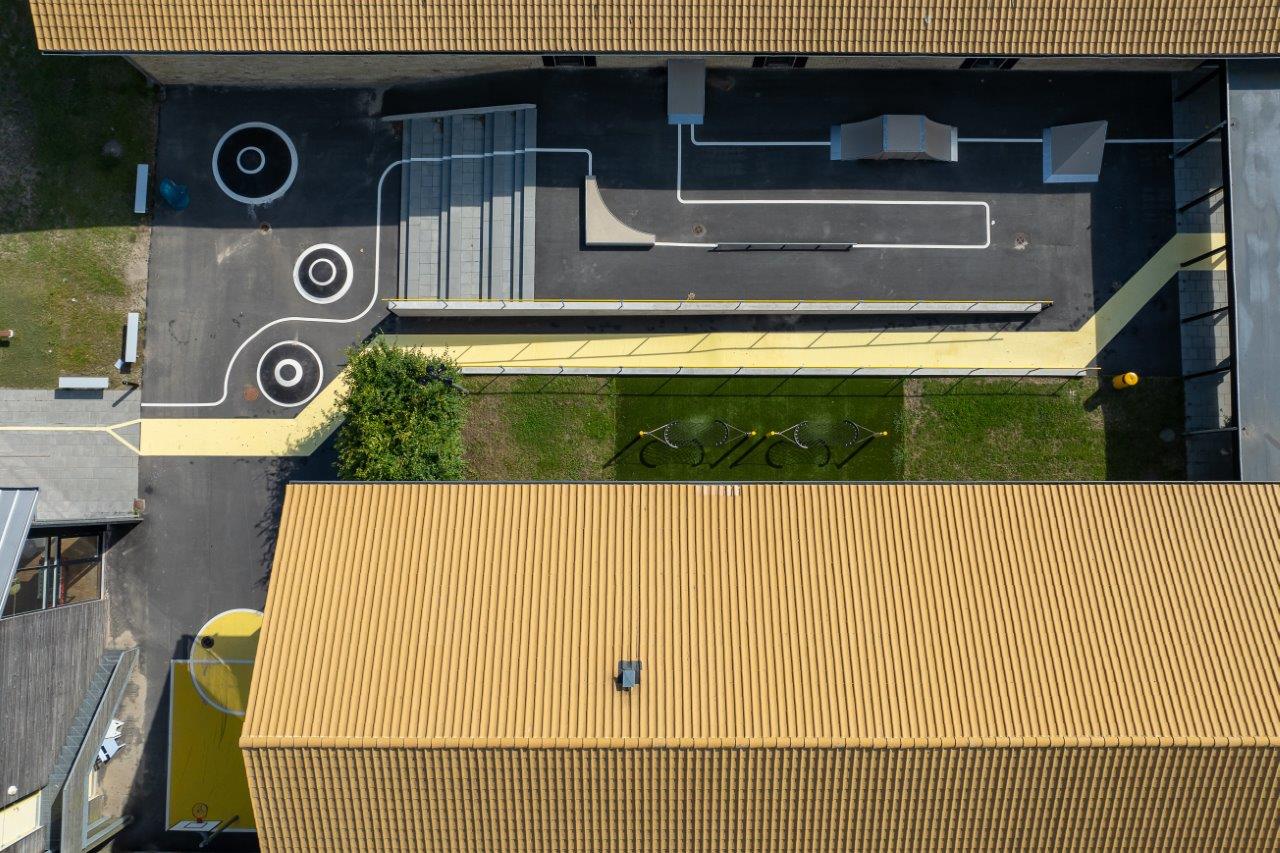 ”Der er også etableret en 300 meter lang hvid linje, som løber sideløbende med den gule sti, men med flere afstikkere til forskellige aktiviteter og kroge i skolegården. Det er en slags aktivitetslinje, hvor brugerne kommer forbi forskellige baner og områder til pauser, lege og spil,” forklarer Morten Groth.