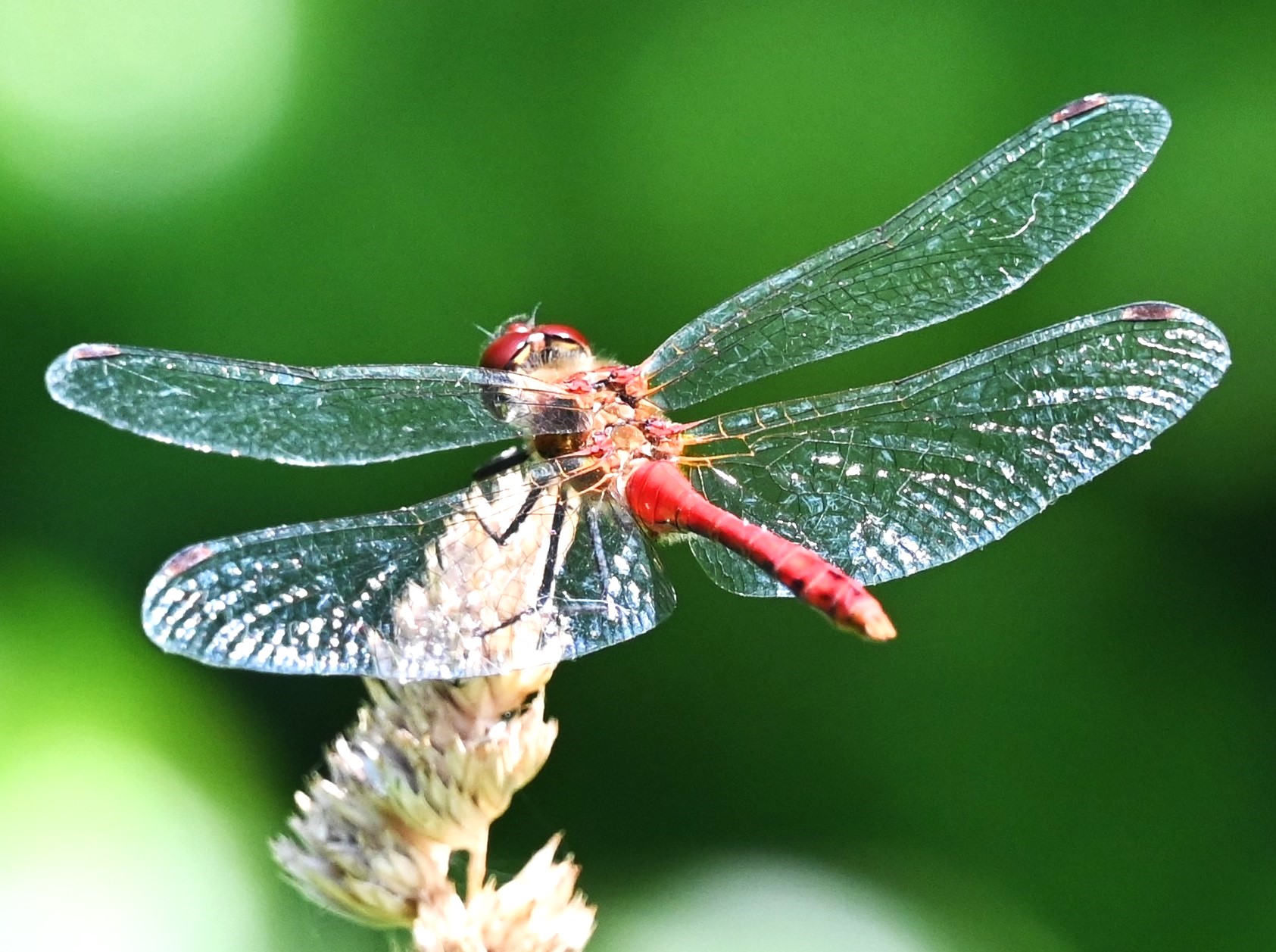 INDIMELLEM sætter guldsmedene sig på vegetation og andet, enten for at fortære et bytte eller hvile sig og slikke solskin, ligesom sommerfugle. Vingerne er iøjnefaldende, de holdes hos de større arter enten ret ud fra kroppen eller fremskudt og paraplyagtigt ludende. Der er to par vinger, cellofangennemsigtige og med et komplekst net af ribber, mere tæt forgrenet end hos bier, myg og fluer. Stiller man skarpt på guldsmedens rygparti synes det klart, at ingeniører her har hentet inspiration. Det er som om motorhjælmen mangler, der er fri inspektionen til det komplicerede flyvemaskineri. Man ser muskler og sener, der forankret i kroppens midterstykke har forbindelse ud til vingernes hovedribber. Dette ophæng styrer ikke alene vingernes orientering i flere frihedsgrader, men tillader også at de to vingepar kan bevæges enten helt uafhængigt af hinanden, en forudsætning for guldsmedens artistiske manøvrer, eller helt synkront, hvad der giver maksimal fremdrift. Og man aner her inspirationen til rotorkonfigurationen i en moderne helikopter, med dens to forskellige og forskelligt orienterede rotorer med hængslede vinger i elastiske ophæng og system af kontrolstænger med forbindelse ind til cockpittet.