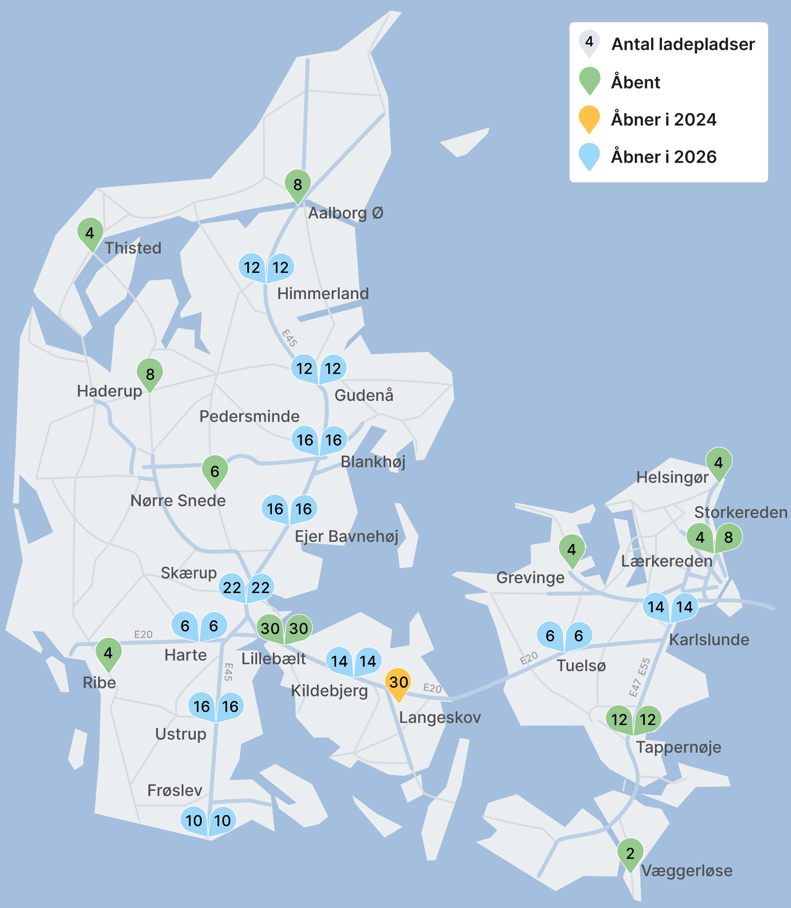 I 2026 åbner Vejdirektoratet yderligere 20 nye ladeparker med samlet set 288 lynladepladser langs de danske motorveje.