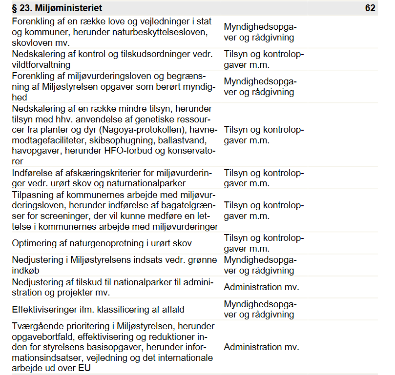 Havet omkring Danmark lider under iltsvind som næppe nogensinde tidligere, biodiversiteten er fortsat i frit fald, og drikkevandet tilsøles mere og mere år for år med landbrugets kemikalier, men al denne elendighed til trods sender SVM-regeringen en fyreseddel til 62 ansatte i Miljøministeriet. Det svarer til 3,1% af alle ministeriets medarbejdere. Nedskæringen følger mere end to årtiers voldsomme reduktioner af miljøindsatsen, som har fjernet hver tredje eller 35 % af alle ansatte i Miljøministeriet siden 2002.