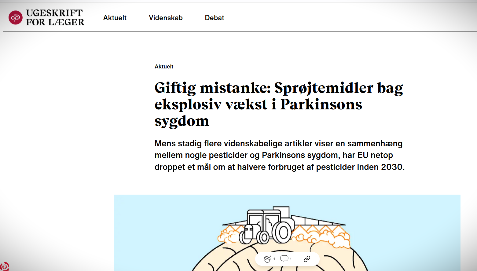 En forskningsartikel dokumenterede sammenhængen mellem sprøjtegifte og Parkinsons Syge allerede i 1985. Sygdommen kan fremprovokeres af mange faktorer, men pesticider fremtræder stadigt hyppigere i den videnskabelige litteratur.