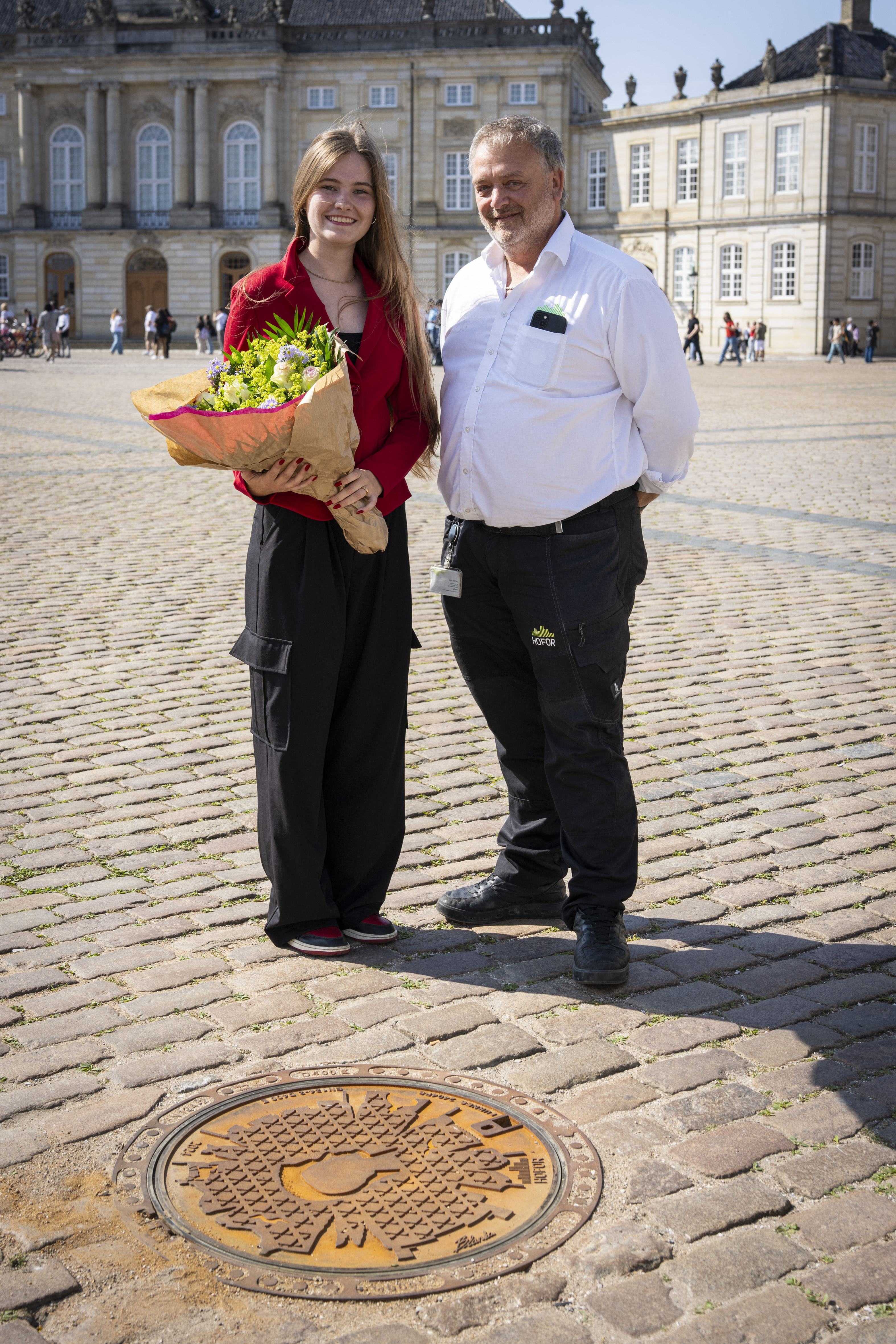 En glad og stolt vinder, Blanka, med sektionsleder i HOFOR, Jan Bregninge, foran dækslet på Amalienborg Slotsplads. Kred. HOFOR
