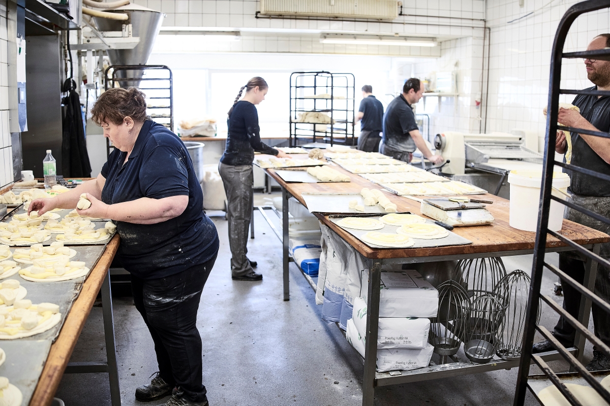 Hun trykker i lynhurtige bevægelser remouncecreme ud på de over 100 kagebunde, der står linet op på bordet. Herefter får hun i et snuptag placeret syv snegle ud på dejen. Inna fra Ukraine har i godt et år lavet Dagmartærter og andet bagværk, der står klar til kunderne i de mange montrer i butikken på Løgstørvejens Bageri i Randers.