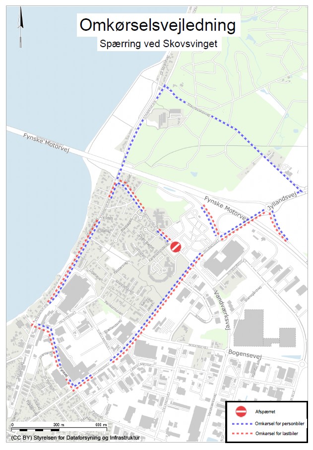 Fra uge 40 og cirka tre uger frem forventer TREFOR Vand, at Skovsvinget bliver totalt spærret for gennemkørende trafik fra Burger King til og med Karensmindevej. Dermed vil trafikanter blive ledt på omkørsel enten via Jyllandsvej og Strandvejen, eller over motorvejen og ad Staurbyskovvej.