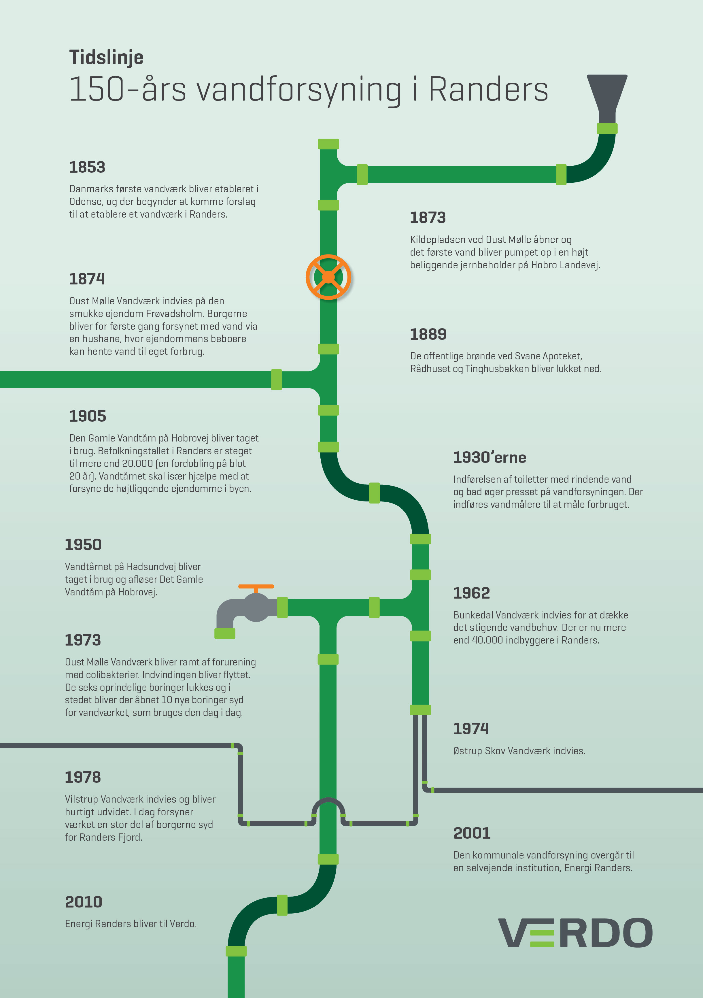 I Randers går vandforsyningens – og dermed også Verdo’s – historie helt tilbage til etableringen af Oust Mølle Vandværk i 1874. Fødselsdagen bliver markeret med reception og åbent hus med aktiviteter for store og små på Vilstrup Vandværk.