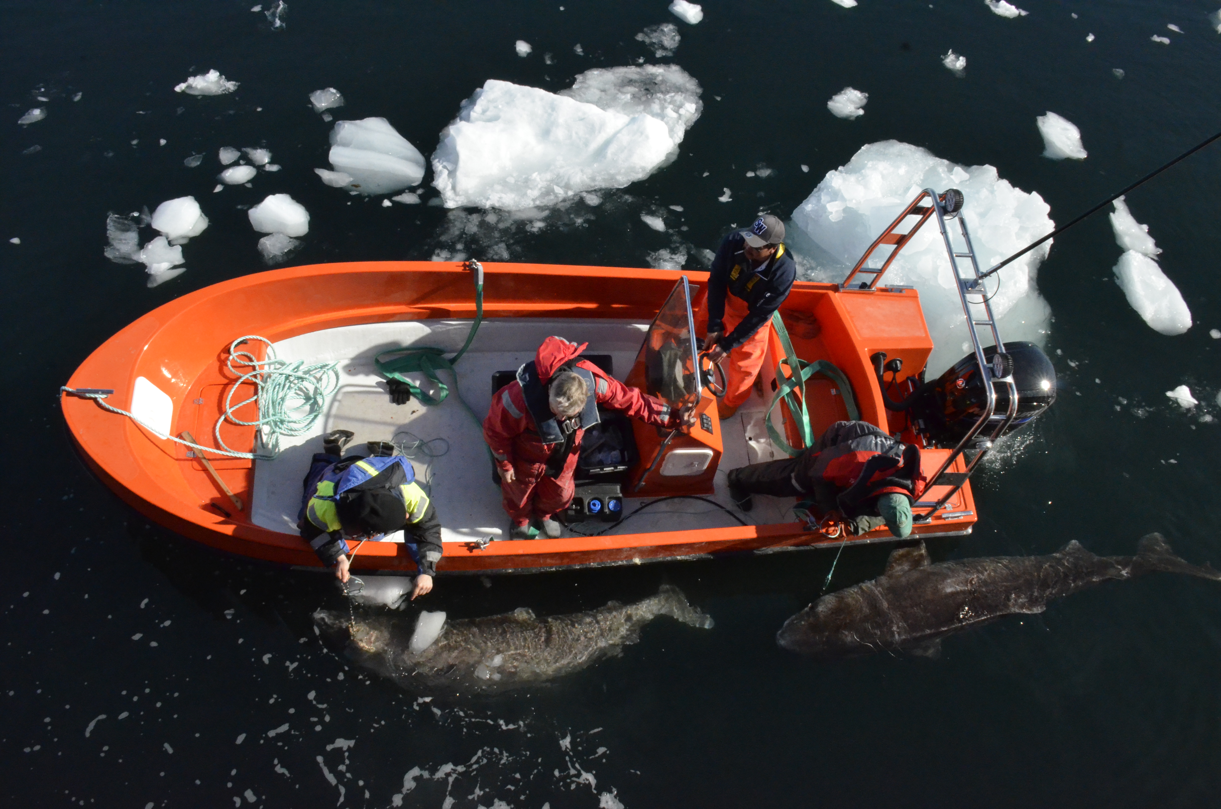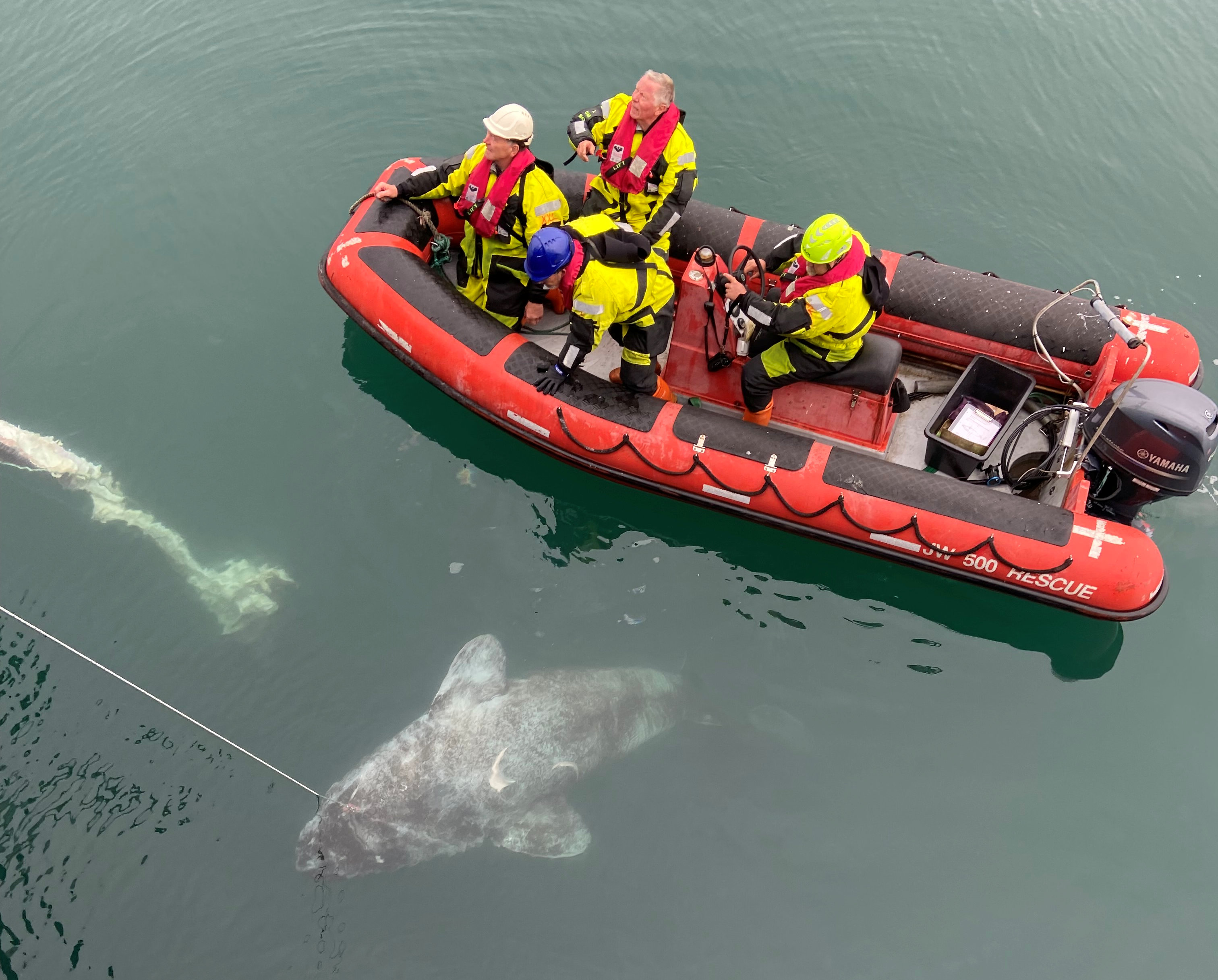 Grønlandshajer på siden af gummibåden. Den ene er spist af en anden Grønlandshaj i løbet af de sidste 12 timer - som en majskolbe hvor kun hoved, hale og ryghvirvler er tilbage.
