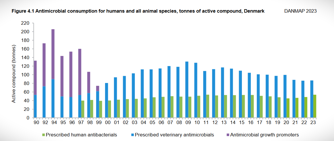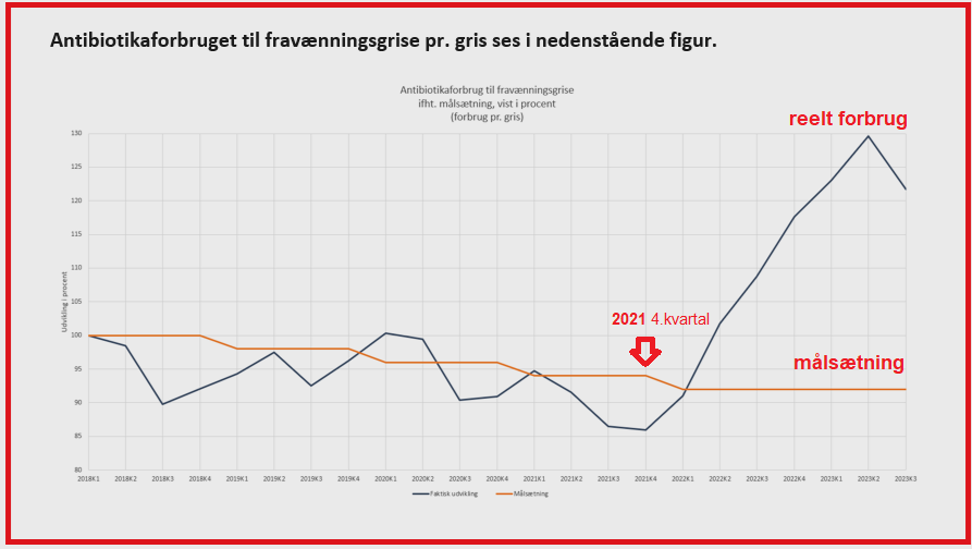 I dag anvendes der mere antibiotika på svinefabrikkerne end for 24 år siden. Forbruget til svin i 2023 var 72,85 tons efter en stigning fra 71,3 tons året før. I procenter var det en stigning fra 82.80 % til 84.03 % af al ordineret veterinær medicin, hvilket er i lodret modstrid med alle erhvervets løfter i veterinærforliget om 8 pct. reduktion i antibiotikaforbruget med udgangspunkt i 2018-niveauet.
