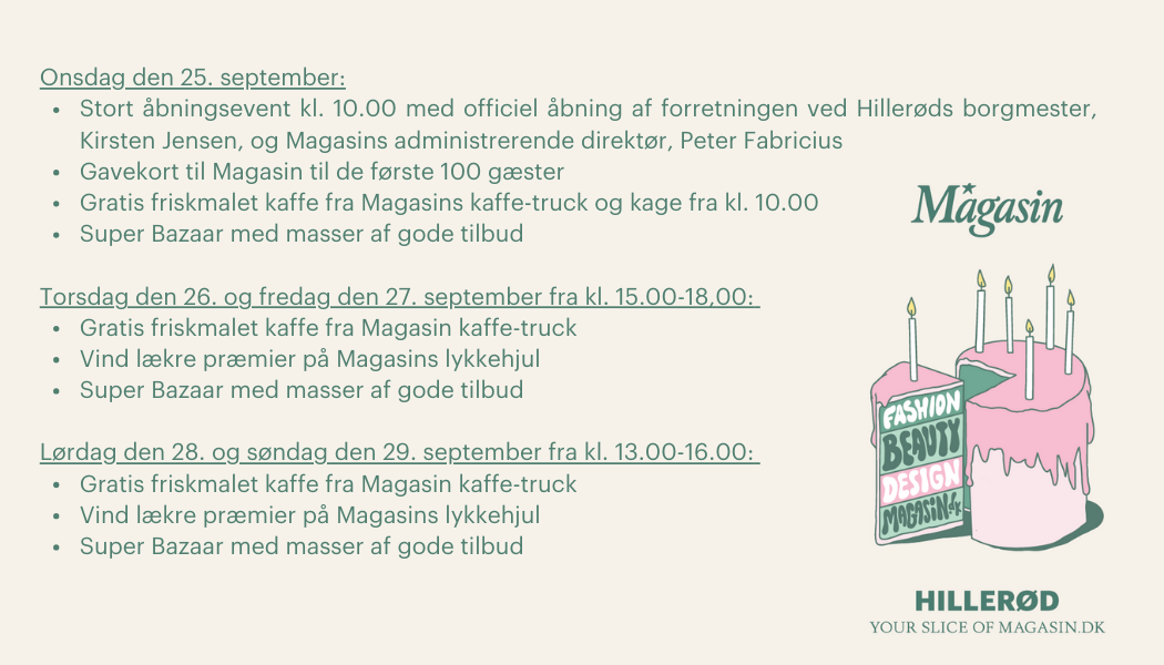 Magasins åbningsfest begynder officielt onsdag den 25. september hvor forretningen åbner med et brag. Festlighederne fortsætter i de efterfølgende dage, hvor man blandt andet kan vinde flotte præmier, nyde gratis kaffe og mange gode åbningstilbud hos Magasin.