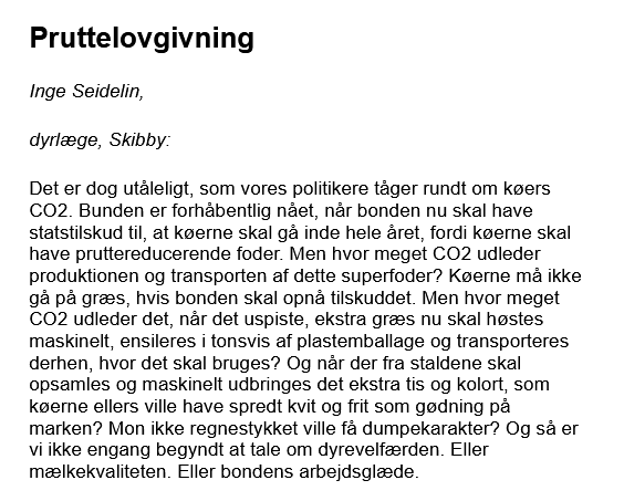 Også i det faglige miljø er der kritik af den kostbare ordning. I et debatindlæg 16/9 med titlen ”Pruttelovgivning” i Politiken mener dyrlæge Inge Seidelin fra Skibby, at ”bunden er forhåbentlig nået, når bonden nu skal have statstilskud til, at køerne skal gå inde hele året, fordi køerne skal have pruttereducerende foder.”