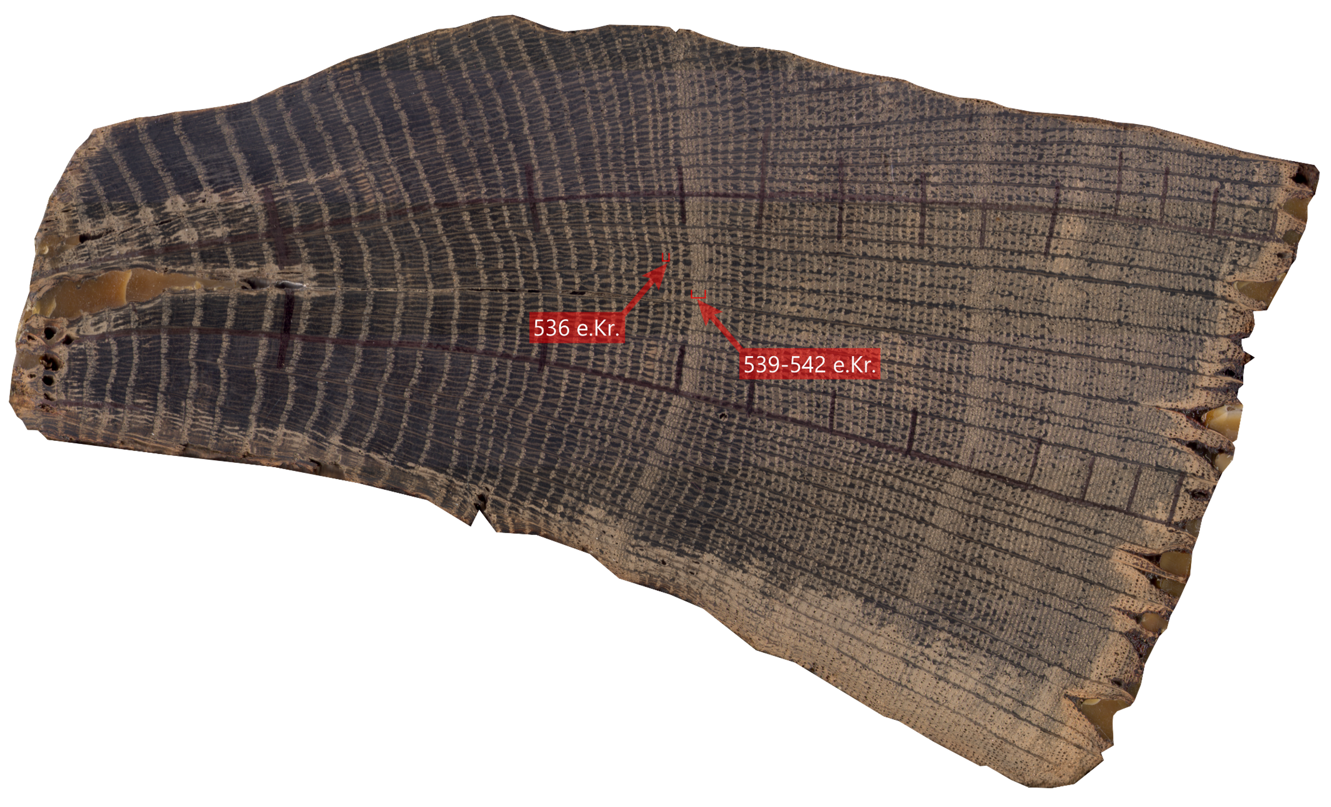 Indtil nu har det været usikkert, hvorvidt klimakatastrofen overhovedet påvirkede livsvilkårene i Danmark. Men ved at studere årringene i mere end 100 stykker egetræ fra 500-tallet kan forskere fra Nationalmuseet nu for første gang påvise en voldsom påvirkning af vækstforholdene.