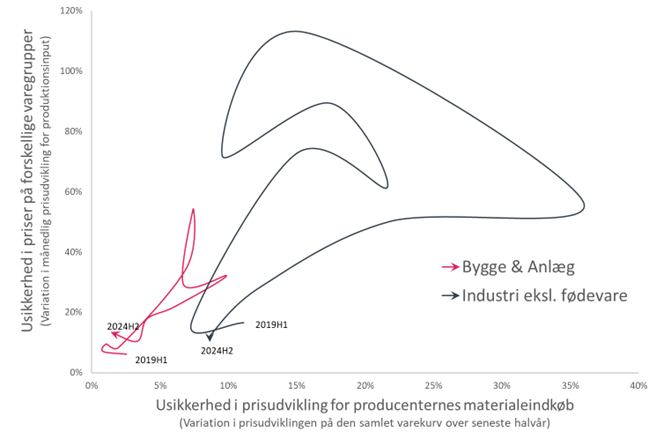 2024 byder på mere stabilitet i omkostningsudviklingen for virksomhedernes indkøbskurv (målt ved standardafvigelsen af varekurvens halvårlige prisstigninger over et halvt år), jf. første-aksen i figuren. Det gælder i særdeleshed for industrien, men vi ser den samme proces for B&A.