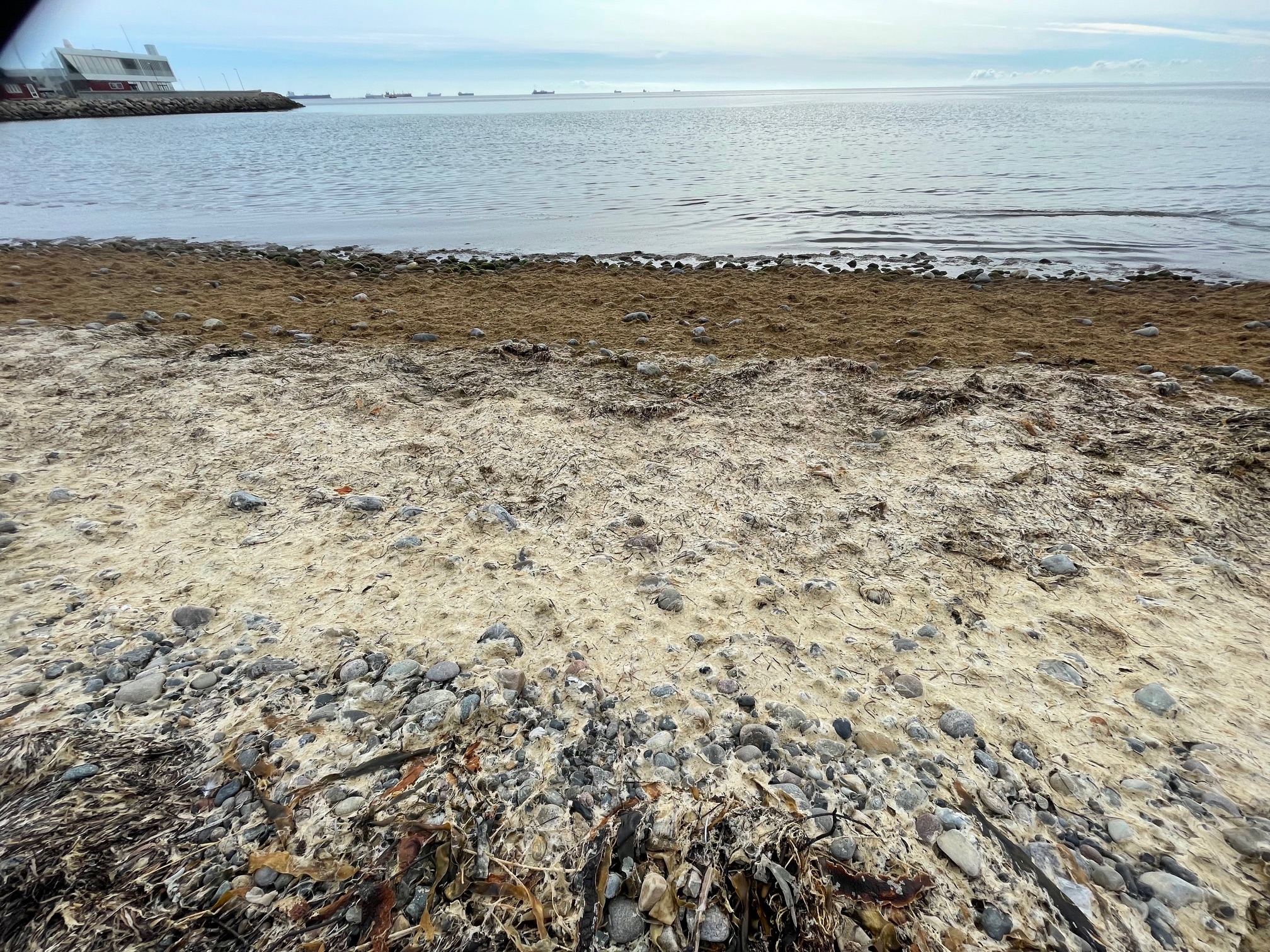 Peter Holm vedlagde billeder af fedtemøg mellem høfderne Grenen 1 og 2 og fra stranden syd for Skagen Havn.
