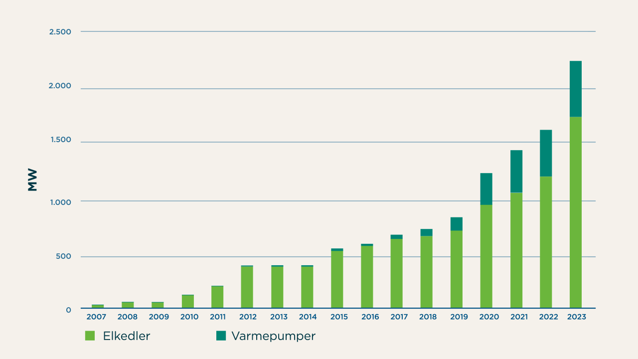 Dansk Fjernvarmes opgørelse viser, at der alene i 2023 blev installeret 615 MW elbaserede løsninger såsom store varmepumper og elkedler. Dermed er 2023 det år, hvor der er opført flest MW el-løsninger efterfulgt af 2020, hvilket er det år, hvor energispareordningen, der gav tilskud til store eldrevne varmepumper, udløb.