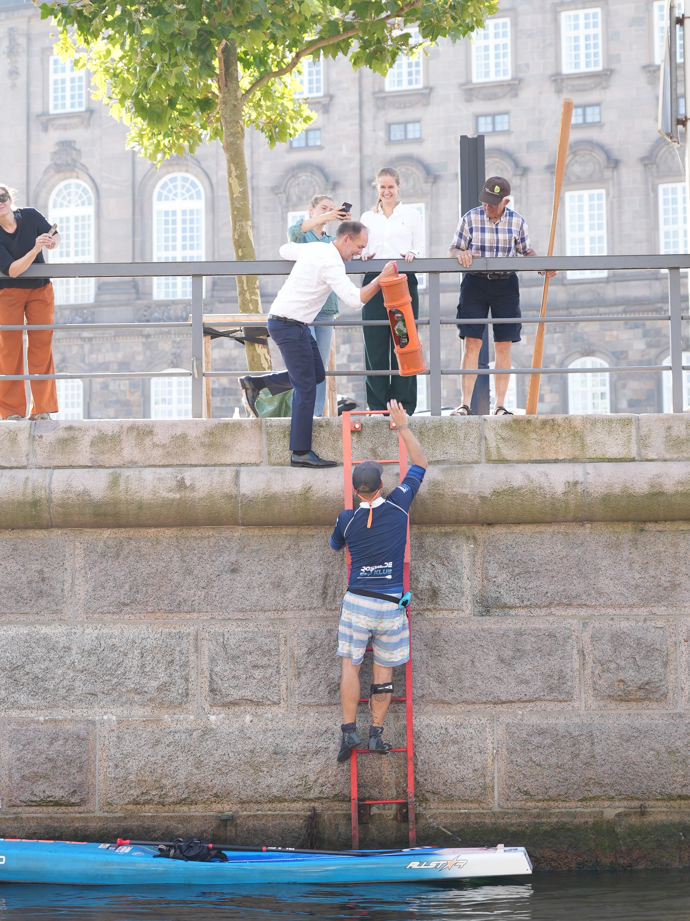 Fredag eftermiddag nåede depechen til København, hvor den på et SUP-board blev sejlet det sidste stykke rundt om Slotsholmen, inden trepartsministeren kunne tage imod den direkte fra kanalen.