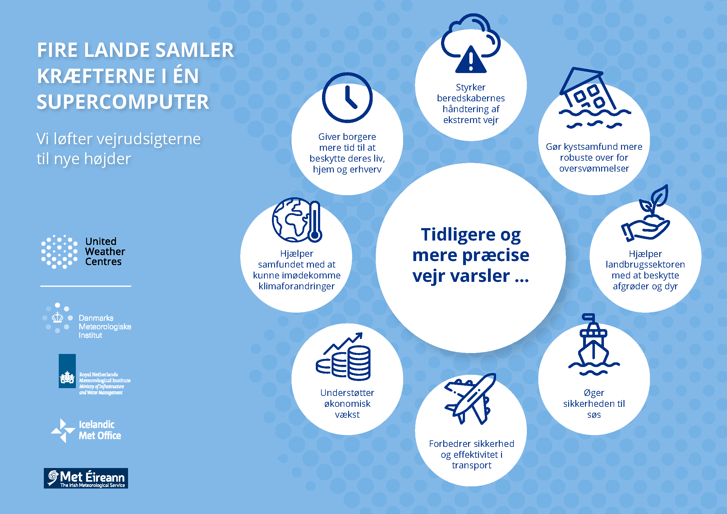 De nationale meteorologiske institutter i Irland, Danmark, Island og Holland er gået sammen om at handle på klimaforandringerne med mere rettidige vejrudsigter på en ny, nu operationel, fælles supercomputer. Det er med til at forberede de enkelte lande på konsekvenserne af vejrmønstre, som forventes at blive mere ekstreme og mere udfordrende at forudsige.