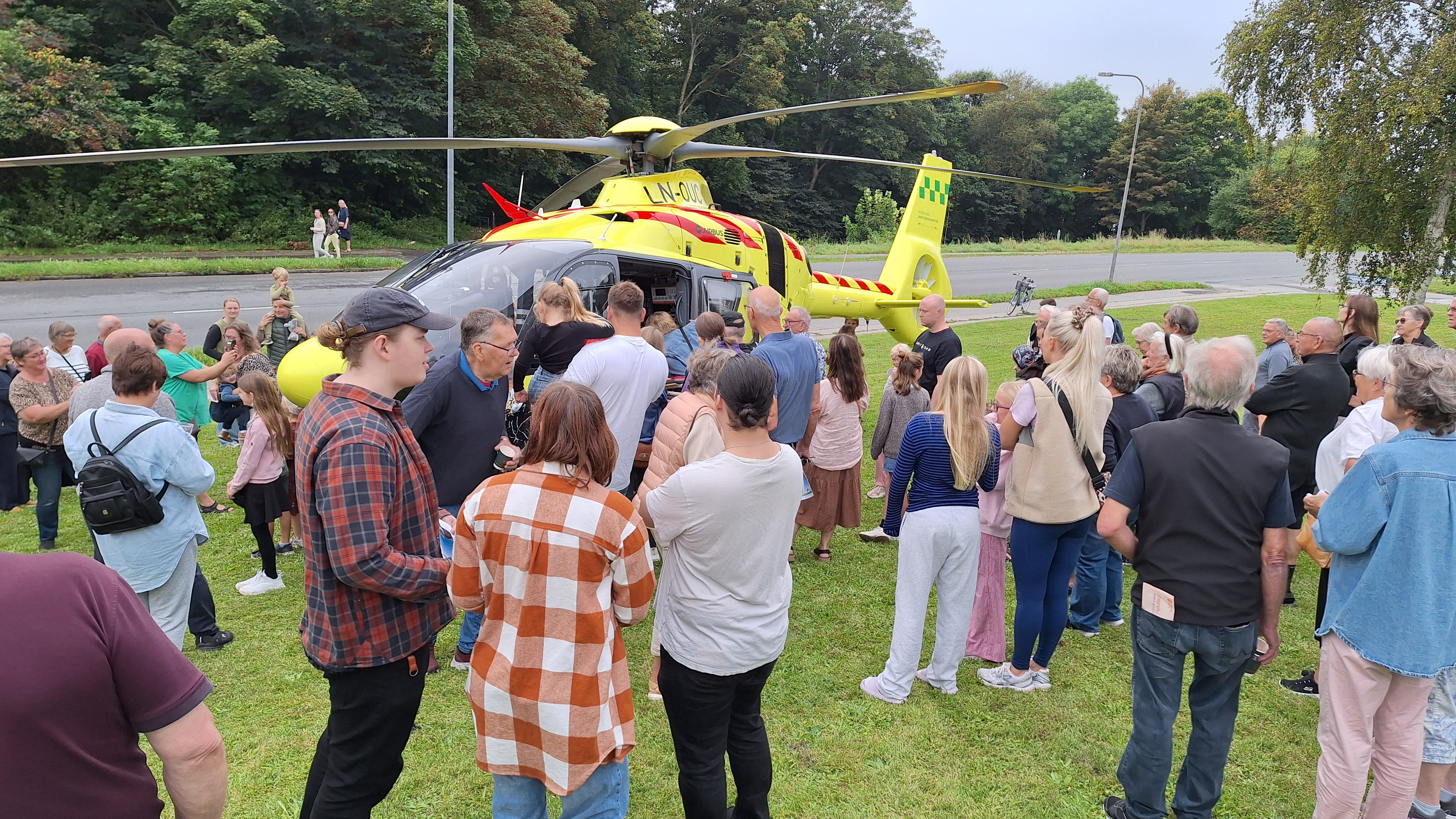 De der blev hængende til omkring middagstid fik en lille ekstra overraskelse med, da vi var så heldige, at akutlægehelikopteren fra Saltum havde mulighed for at komme og lande bagved sundhedshuset.